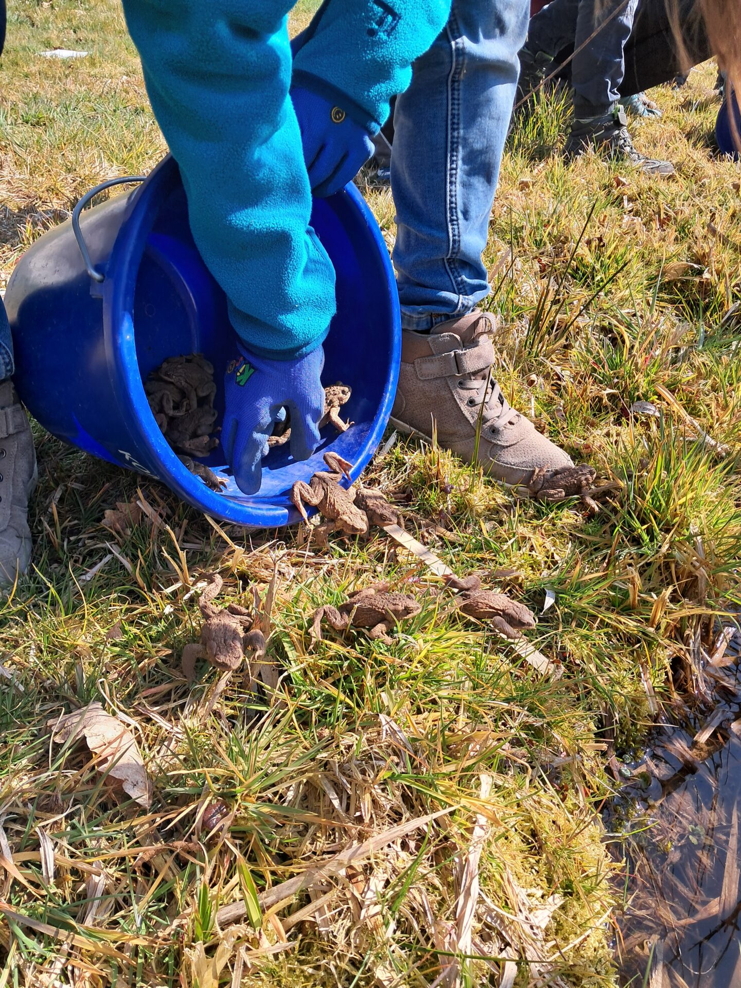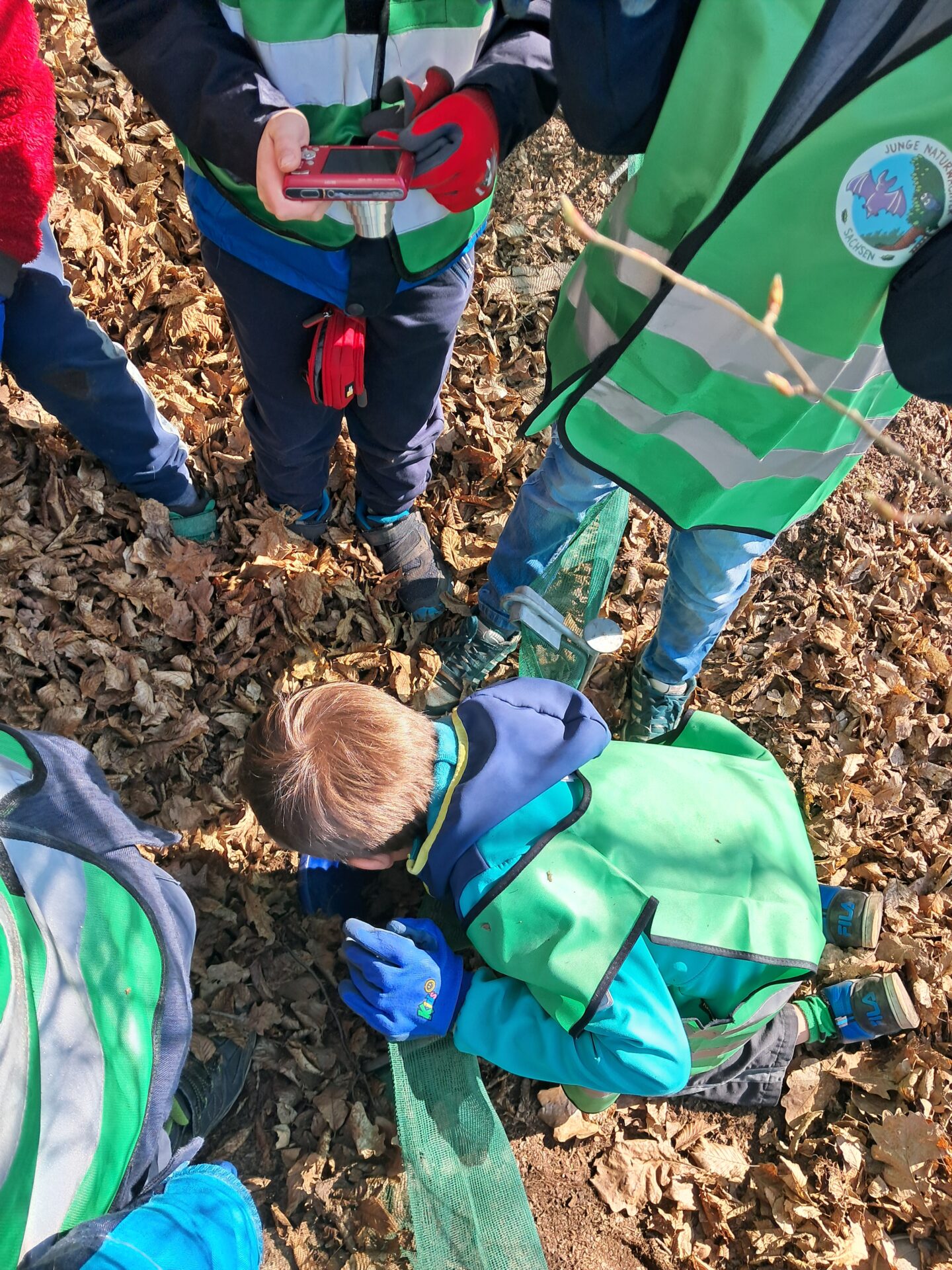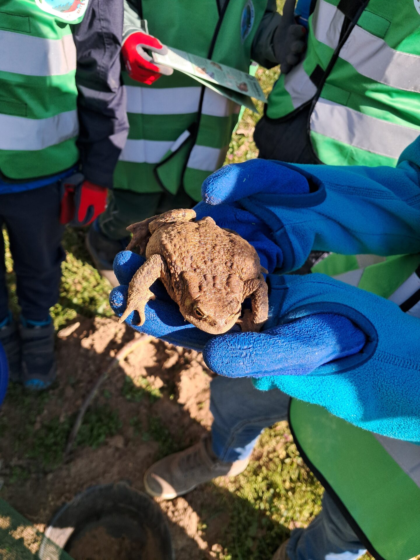 Am Samstag den 22.03.2025 waren die JuNas der Naturschutzstation Weiditz nicht faul und haben den ehrenamtlichen Helfern am Amphibienschutzzaun geholfen.Ausgerüstet mit Warnwesten, Eimern und Handschuhen, zum Schutz der empfindlichen Tiere, fuhren wir nach Elsdorf, wo es zwei dieser Zäune gibt. Sorgfältig überprüften wir jeden Abschnitt der Schutzzäune und schauten in jeden der Eimer, die in den Boden eingelassen sind. Über 50 Erdkröten und ein Molch wurden von uns vorsichtig aus den Eimern genommen und über die Straße getragen zum Teich. Natürlich haben wir dabei ganz genau aufgeschrieben, welche Arten wir in den Eimern gefunden haben, auch die Anzahl und das Geschlecht wurden festgestellt. Das ist für eine Bestandsaufnahme der Amphibienvorkommen wichtig. Dabei lernten wir auch gleich den Unterschied zwischen Fröschen, Kröten und Molchen kennen und wie man die Männchen von den Weibchen unterscheidet.