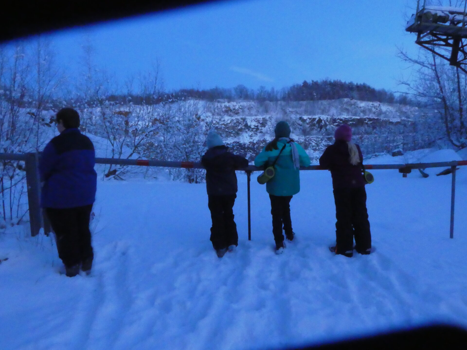 Gegen 17:15 Uhr ging es dann auf abendliche Exkursion an den Rand des Steinbruches Klunst in Ebersbach, um den Rufen des Uhu zu Lauschen. Trotz Minustemperaturen harten die Mutigen Molche tapfer aus, bis nach 30 min der Ruf des Uhu-Männchens zu vernehmen war. Der Uhu ist also in sein Brutrevier zurückgekehrt. Gebannt lauschten die Molche minutenlang dem Uhu bis dessen Rufe in der Nacht verhallten.