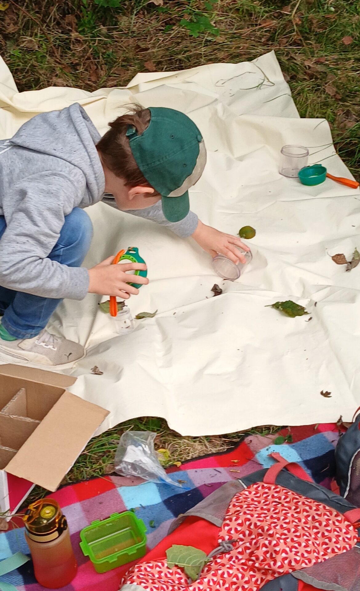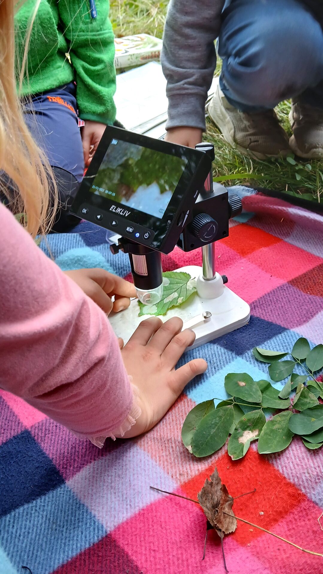 Die Kinder lernten, dass viele Tiere auf eine oder einige wenige Baumarten spezialisiert sind. Oft findet man die Vorliebe der Tiere oder deren Larven bereits im Namen: Buchenspringrüssler, Eichenprozessionsspinner und Pappelblattroller sind nur einige Beispiele. Die Kinder ertappten die Larve des Eichelbohrers, eines imposanten Rüsselkäfers, der seine Eier in Eicheln legt, auf frischer Tat, fanden in Eichengallen die Larven sowie ein ausgewachsenes Insekt der Eichengallwespe und konnten sogar Lindenminiermotten im Mikroskop beobachten.