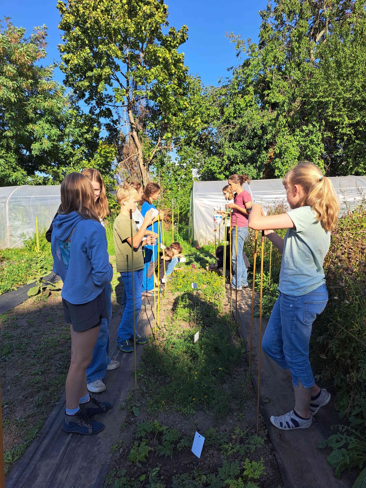 Anschließend durften die JuNas mit Christine Hausdorf die Gärtnerei des Projektes besuchen. Dort werden heimische Wildpflanzen herangezogen, die besonders wertvoll als Nahrungsquelle für Wildbienen sind. Zwischen duftenden Kräutern und blühenden Wiesenpflanzen lernten die Jugendlichen verschiedene Wildbienen-Bruthilfen und Lebensräume kennen – und packten selbst mit an!