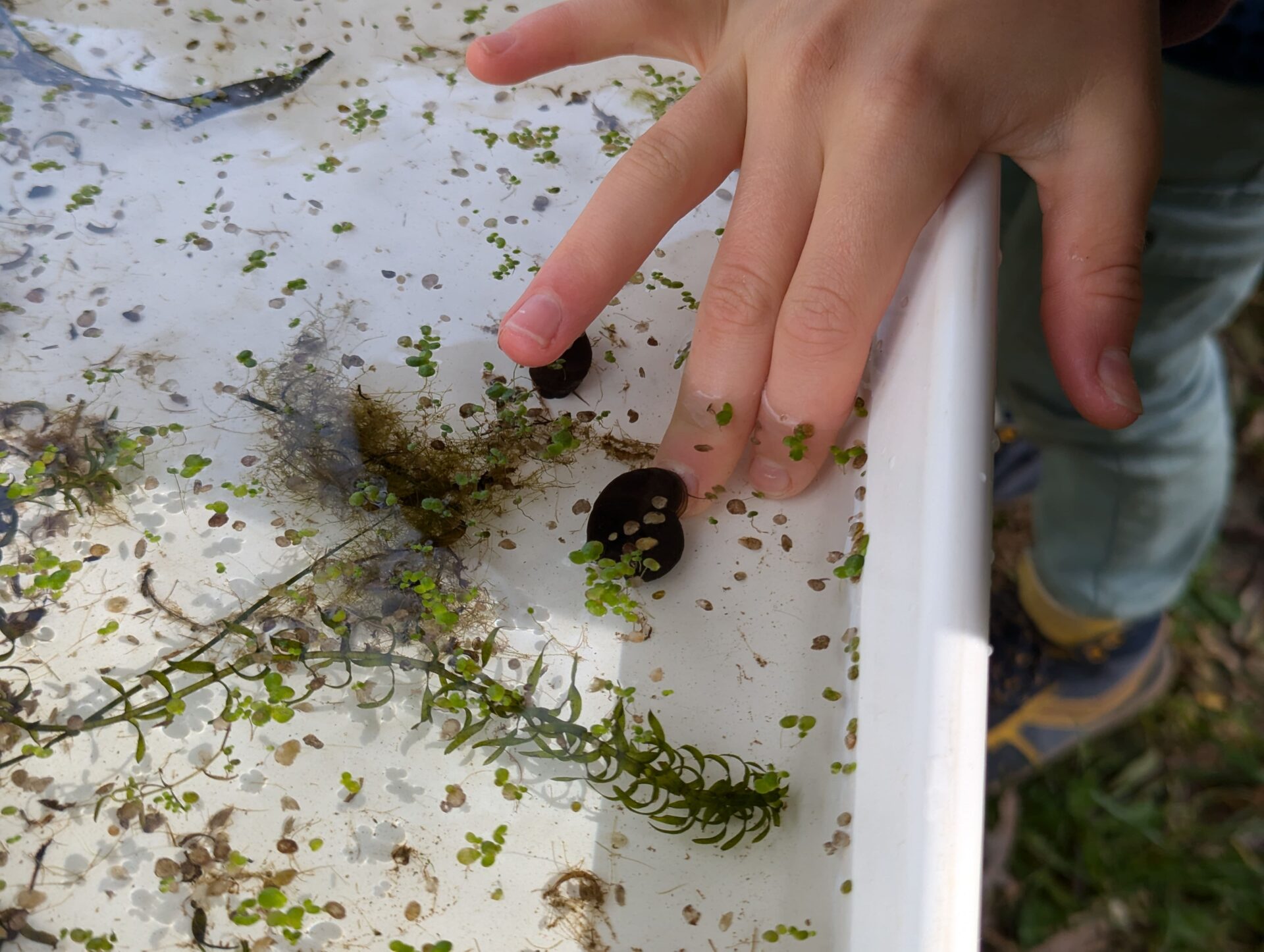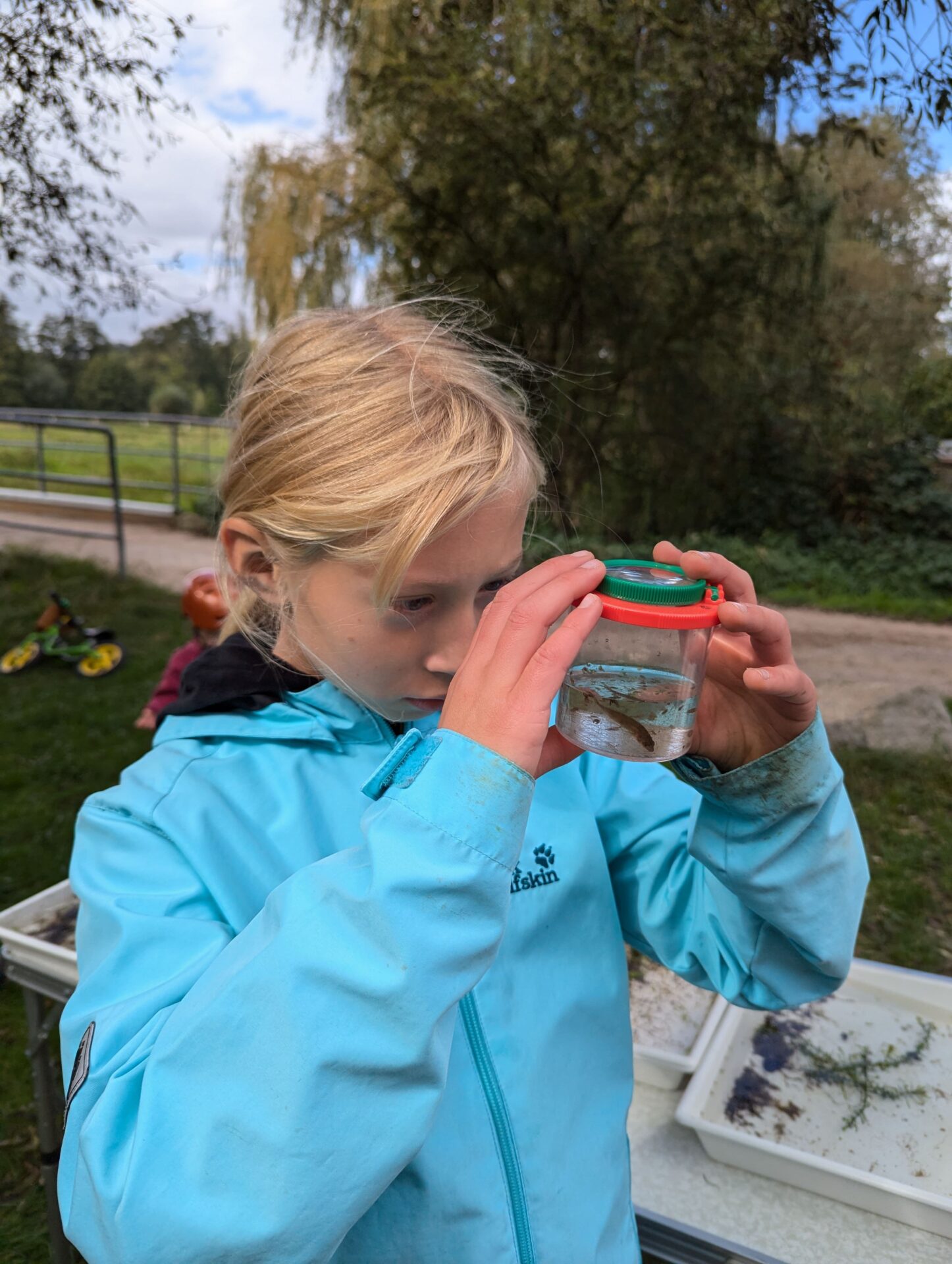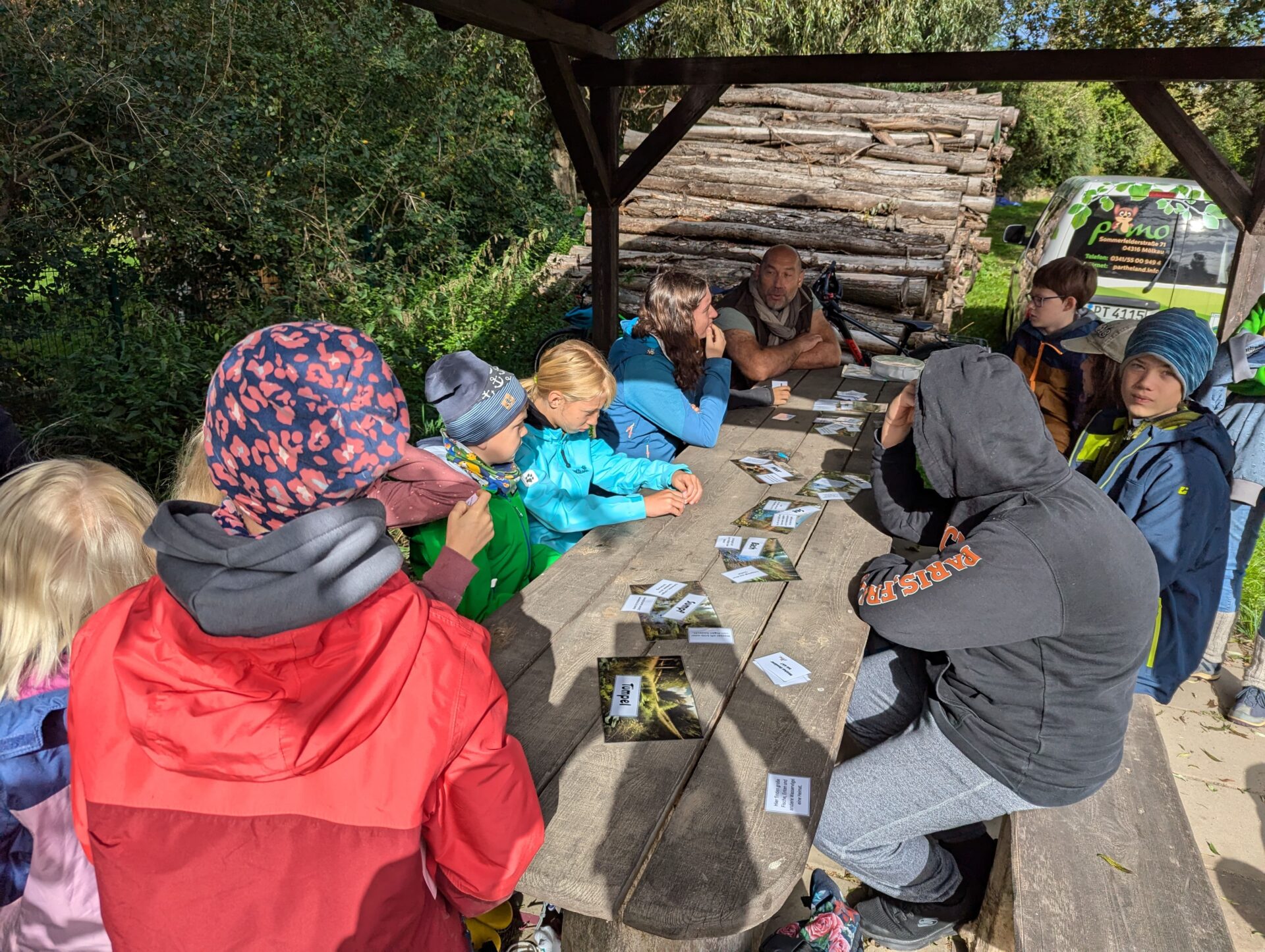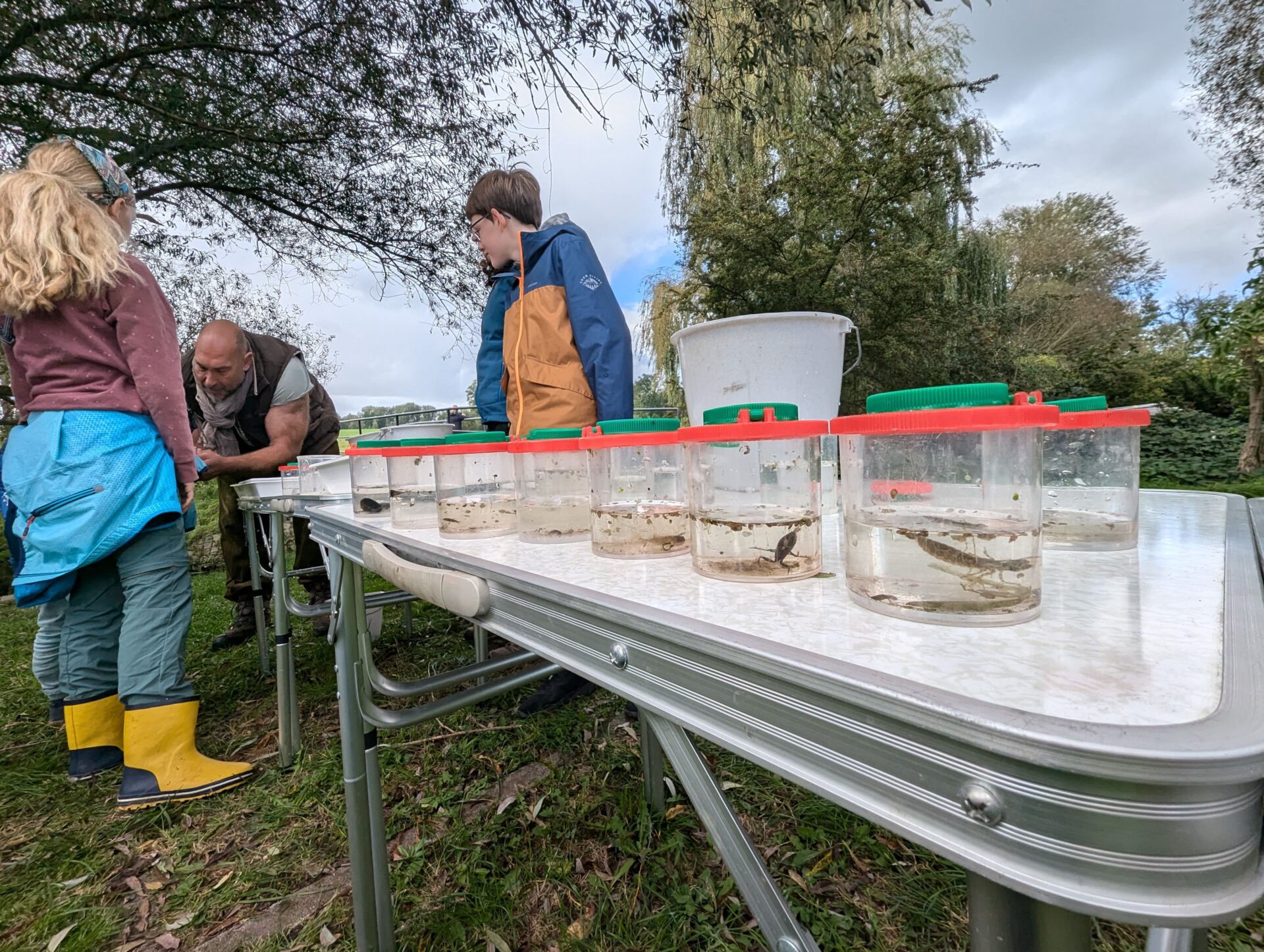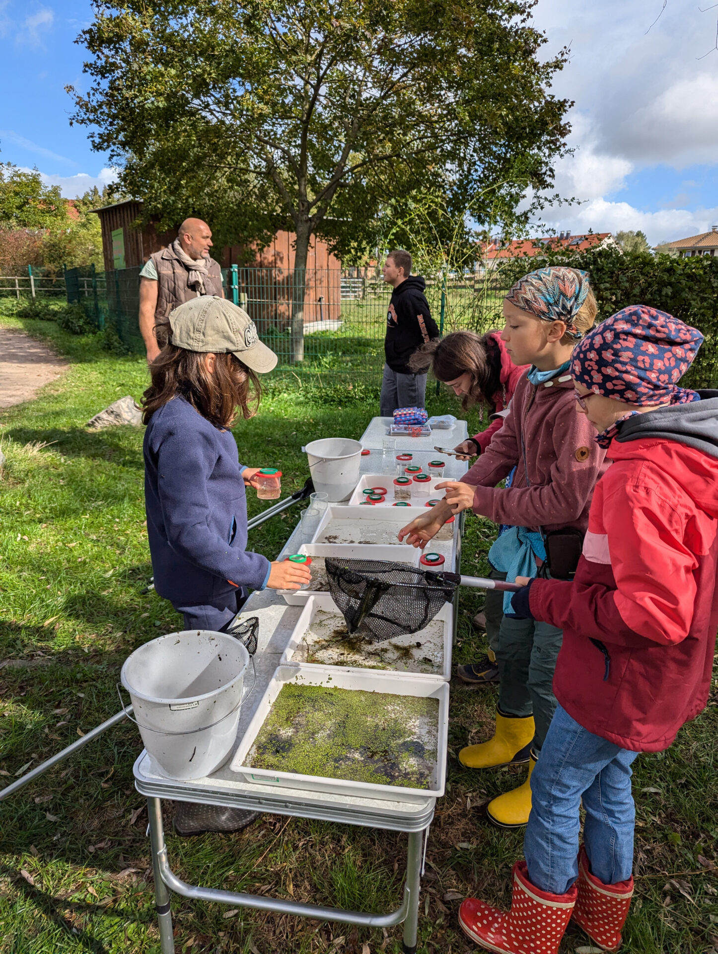 Der Höhepunkt des Tages war das Keschern in der Parthe. Die Kinder suchten nach Kleinstlebewesen, die uns Aufschluss über die Wasserqualität des Flusses geben sollten. Sie entdeckten zahlreiche spannende Tiere, darunter Blutegel, zwei verschiedene Fischarten, Rückenschwimmer, Bachflohkrebse, Gelbrandkäfer, Wasserskorpione, Libellenlarven und verschiedene Fliegenlarvenarten. Diese erstaunliche Vielfalt zeigte uns direkt, dass die Wasserqualität der Parthe hier sehr gut sein musste, da solche Lebewesen nur in gesunden Gewässern vorkommen.