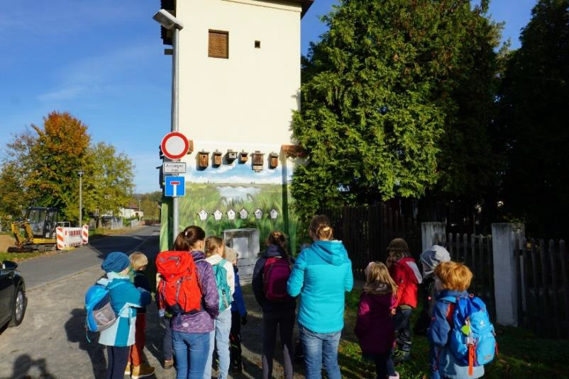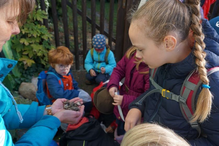 Zuerst haben wir uns in Taucha auf Spurensuche unter dem alten Trafoturm und jetzigen zu Hause einer Schleiereule begeben. Unterhalb der Nisthöhle konnten wir unzählige Knöchelchen von unterschiedlichen Nagern finden und auch noch gut erhaltene Gewölle. Die Kinder konnten anhand der verschiedenen Zahntypen erkennen, dass es sich bei den Beutetieren um unterschiedliche Mäusearten handelte. Wir haben uns über die anatomischen Besonderheiten von Eulen und insbesondere über die Sinne, verschiedene heimische Arten (Schleiereule, Waldkauz, Waldohreule und Steinkauz) und deren Lebensweisen ausgetauscht.