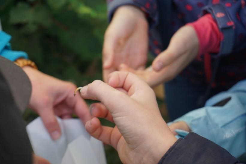 Zu unserer großen Freude schwebte ein Mäusebussard über unsere Köpfe hinweg und ließ seinen Ruf hören. Wir haben weiterhin über heimische Greifvogelarten wie den Roten Milan, den Mäusebussard, den Turmfalken, den Sperber und Habicht und ihre Erkennungsmerkmale, z.B. anhand der Federfärbung und Flugsilhouette gesprochen, Bilder angeschaut und ein Zuordnungsrätsel gelöst. Was frisst eigentlich ein Roter Milan und warum ist er Ende Oktober nicht mehr bei uns zu sehen? Auch dies war Thema. Die „JuNas“ durften auch selbst in die Rolle eines Greifvogels oder einer Eule schlüpfen und spielerisch „Beute schlagen“. Nach einer Stärkungspause mit Erdbeertorte haben wir eine Bussardfeder und eine Feder einer Waldohreule genauer unter die Lupe genommen, die Beschaffenheit und Struktur verglichen und ein Hörexperiment durchgeführt. Diesmal konnten die Kinder ein Arbeitsblatt mit Lückentext zum Thema ausfüllen und als Wissensschatz für ihren JuNa-Ordner mitnehmen.