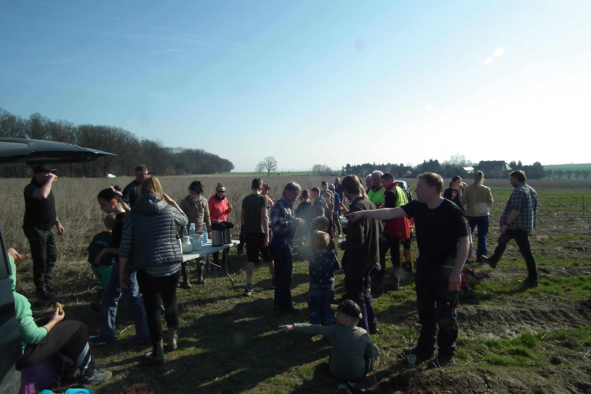 Obstbäume, Faulbaum, Schwarzdorn, Weißdorn, Pfaffenhütchen, Elsbeere, Speierling, Eberesche, Hainbuche, Feldahorn und Traubeneiche wachsen bereits auf der Fläche. Diesmal warteten kleine Flatterulmenpflanzen auf uns. Vom Treffpunkt aus gingen wir gemeinsam auf die Fläche und wurden von den Forstwirten Herrn Plänitz und Herrn Kube bereits erwartet. Sie staunten nicht schlecht als wir kamen, denn 50 Helfer sind schon eine ganze Menge. Sie zeigten uns, wie man einen Baum richtig pflanzt und in welchen Abstand die Bäume gepflanzt werden. Zusätzlich zu unseren Spaten konnten wir den „Fahrradlenker“ zum Pflanzen verwenden, ein Forstwerkzeug der Forstwirte. Mit viel Elan gingen alle an die Arbeit und sehr schnell konnten viele Pflanzen in die Erde gebracht werden. Es war eine super Zusammenarbeit und alle unterstützen sich gegenseitig. Die Kinder durften sogar die Pflanzstellen mit dem Spray markieren… ein sehr begehrter Job. So viel Arbeit macht hungrig und so gab es eine kleine Pause.  Zur Stärkung gab es Kinderpunsch und leckeren Kuchen sowie Zeit, miteinander ins Gespräch zu kommen.