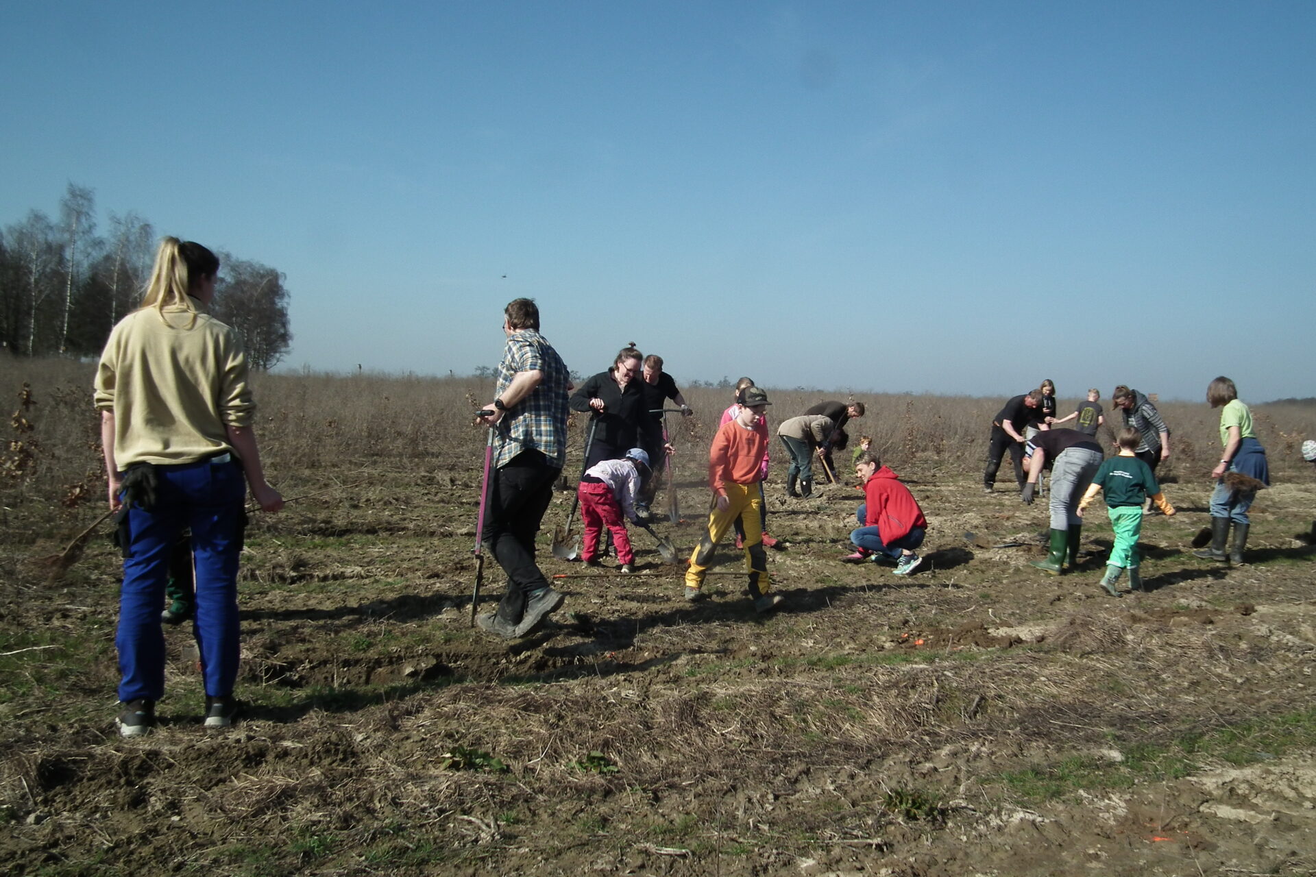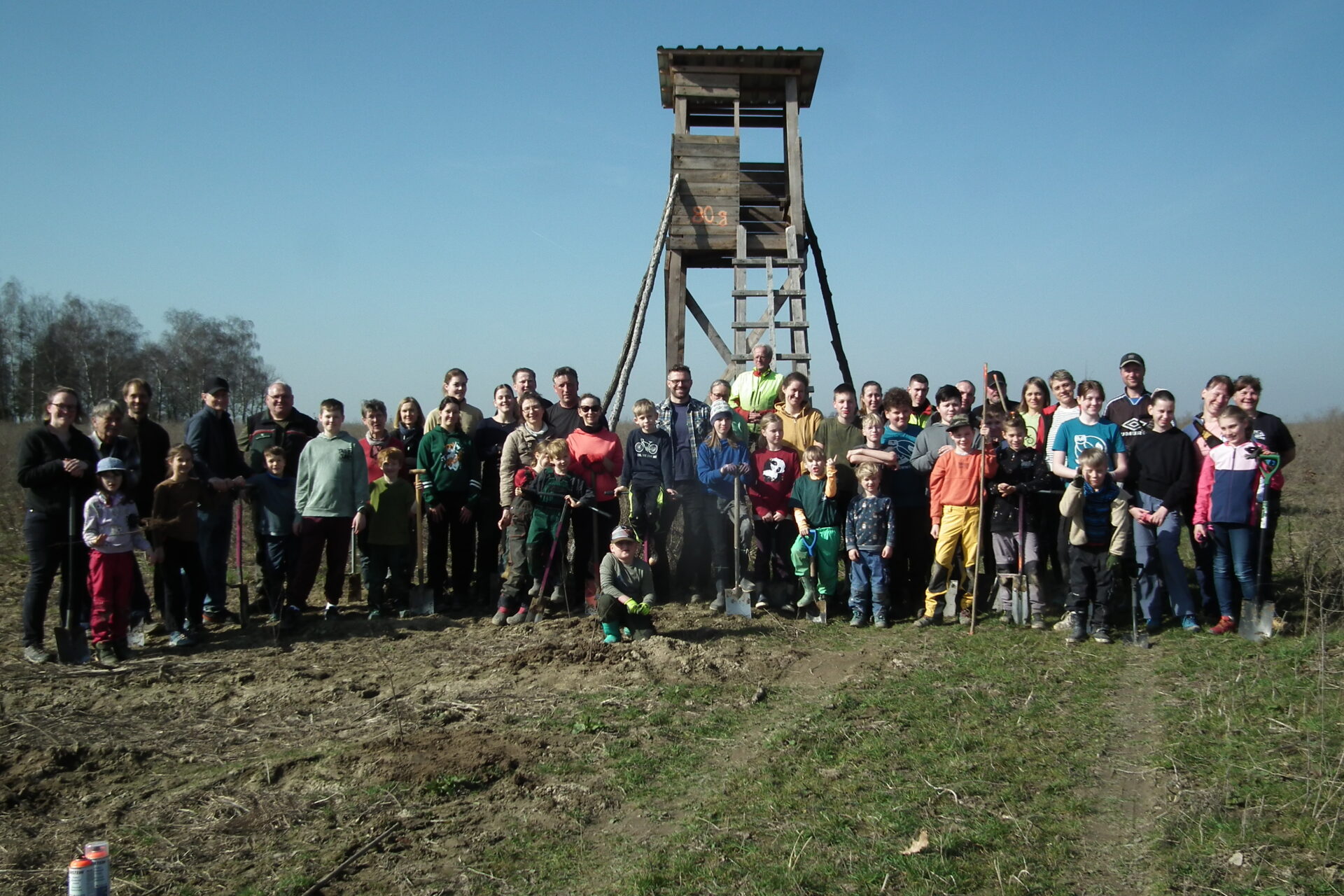 Einmal im Jahr treffen sich die Jungen Naturwächter der Kinder- und Jugendumweltgruppen Naundorf mit dem Staatsbetrieb Sachsenforst zur gemeinsamen Pflanzaktion. Wir waren auf der ca. 10 ha großen Aufforstungsfläche aktiv, auf der wir vor 2 Jahren schon 2 Streuobstwiesen und Hecke gepflanzt haben. Damals war das Wetter nebelig, kalt und es regnete. Diesmal begrüßte uns Revierförster Mario Erdmann am 7. März 2026 bei frühlingshaftem Wetter recht herzlich und stellte uns und unseren Helfern (Eltern, Großeltern, Geschwister) das Vorhaben vor.