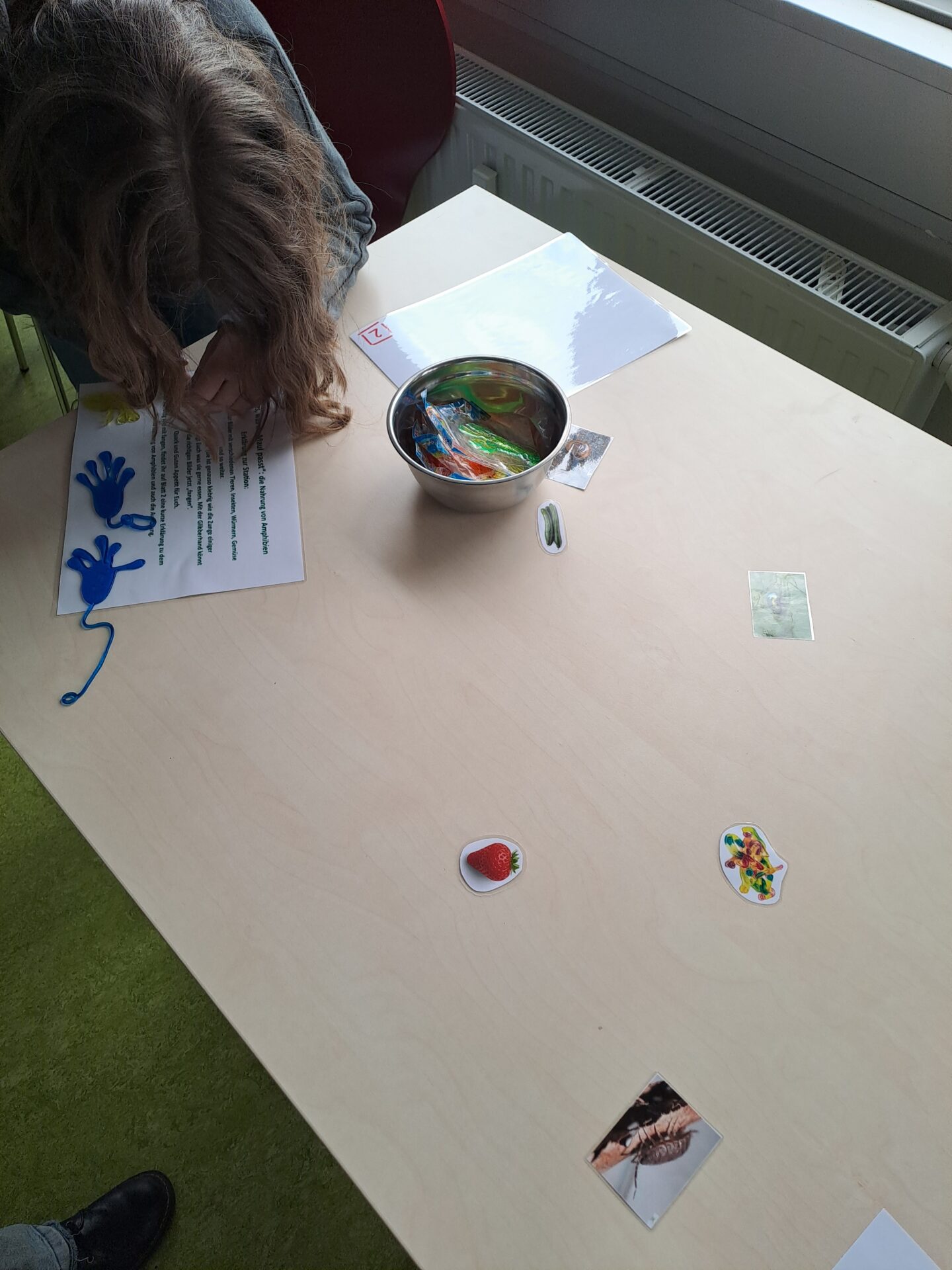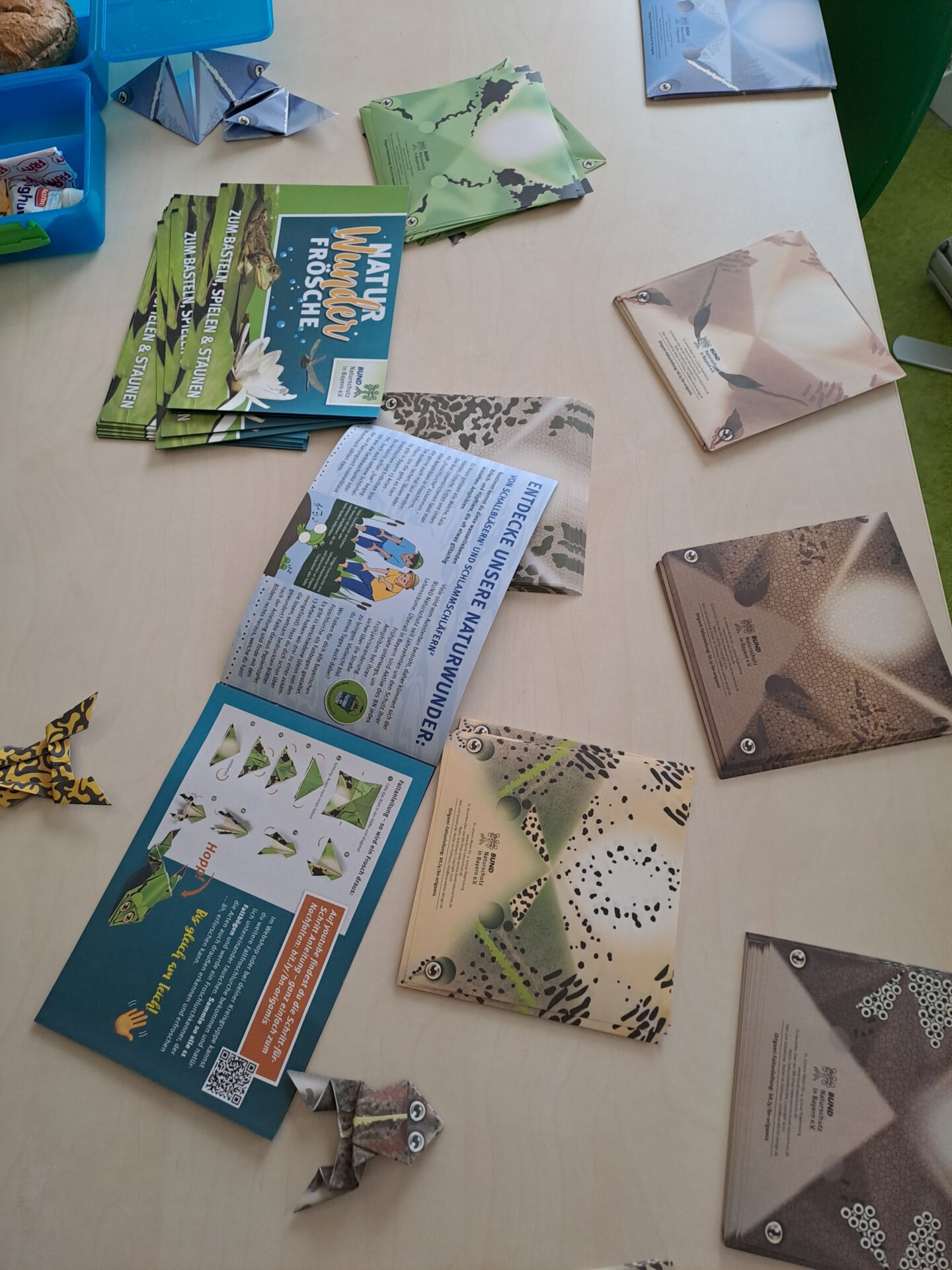 Für Profis gab es noch eine Station an der verschiedene Amphibien mit Hilfe einer Bestimmungshilfe bestimmt werden konnten und dann in Ihre Gruppen (z.B. Schwanzlurche oder Froschlurche) sortiert werden konnten. Kreative und geduldige Köpfe konnten an einer Station Origamifrösche falten und auch diese bestimmen und zuordnen. Das Origamipapier war je nach Art des Frosches oder der Kröte spezifisch bedruckt.