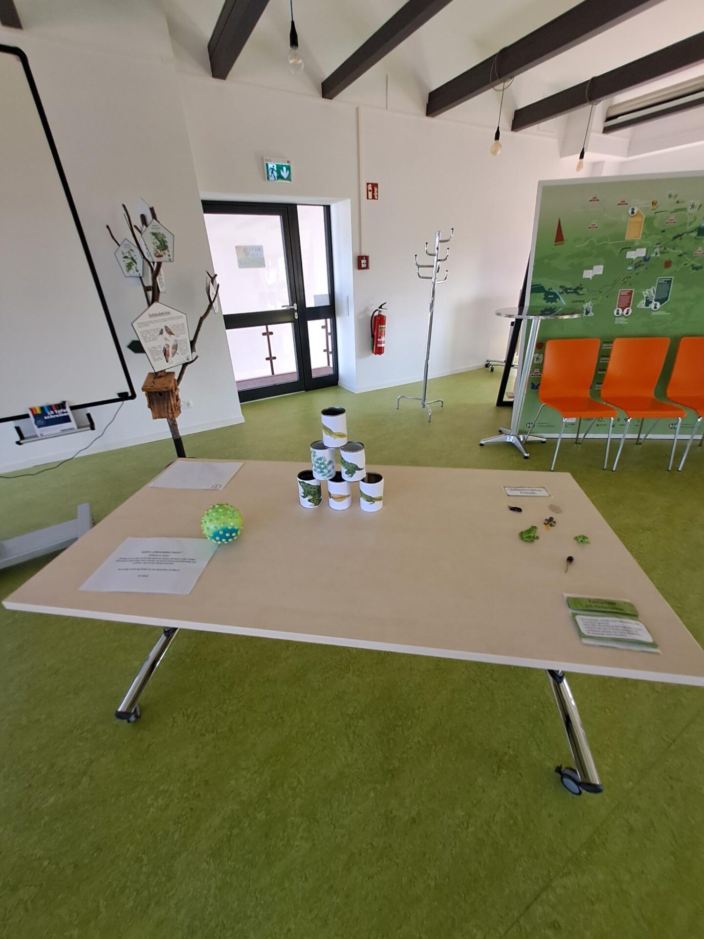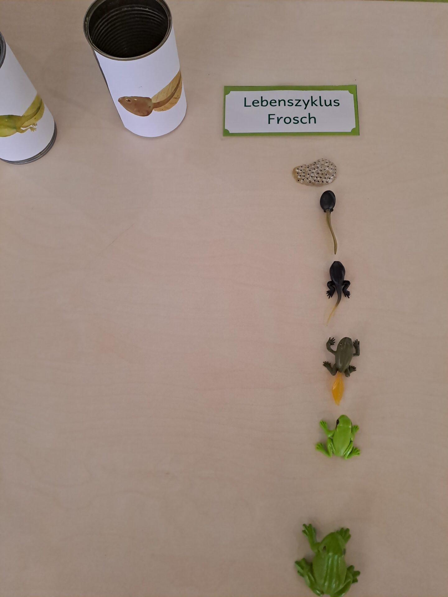 Als Einstieg in das Thema, gab es mehrere Wissensstationen zum Mitmachen. Die Stationen waren sowohl für Einsteigerwissen geeignet, aber auch für unsere älteren JuNas in der Gruppe mit bald schon Expert*innenwissen. So konnte z.B. bei einem Dosenwurfspiel der Lebenszyklus eines Frosches sortiert werden (auf den Dosen sind Bilder mit dem Lebenszyklus aufgeklebt, die nach dem abwerfen wieder sortiert werden konnten