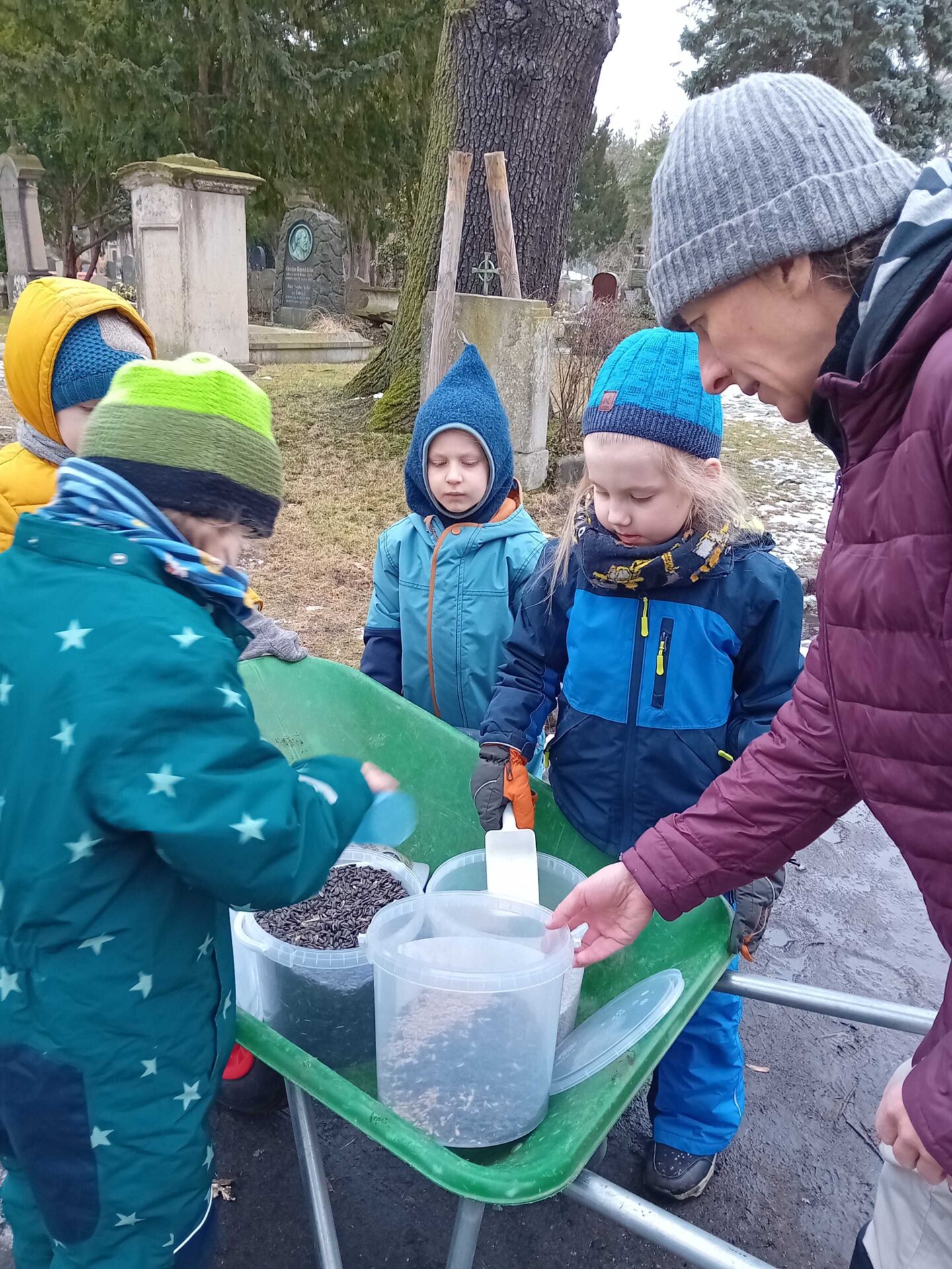 Trotz der winterlichen Temperaturen herrscht auf dem Trinitatisfriedhof aktuell reges Treiben – und das liegt nicht nur an den Vögeln! Am 04. Februar 2026 hieß es für unsere „Grashüpfer“ wieder: Ärmel hochkrempeln und aktiv werden. Unser Ziel? Die zahlreichen Vogelfutterstellen auf dem Gelände, die nach den kalten Tagen dringend eine Auffüllung gebrauchen konnten: Ein Buffet für Sperling, Meise und Co.