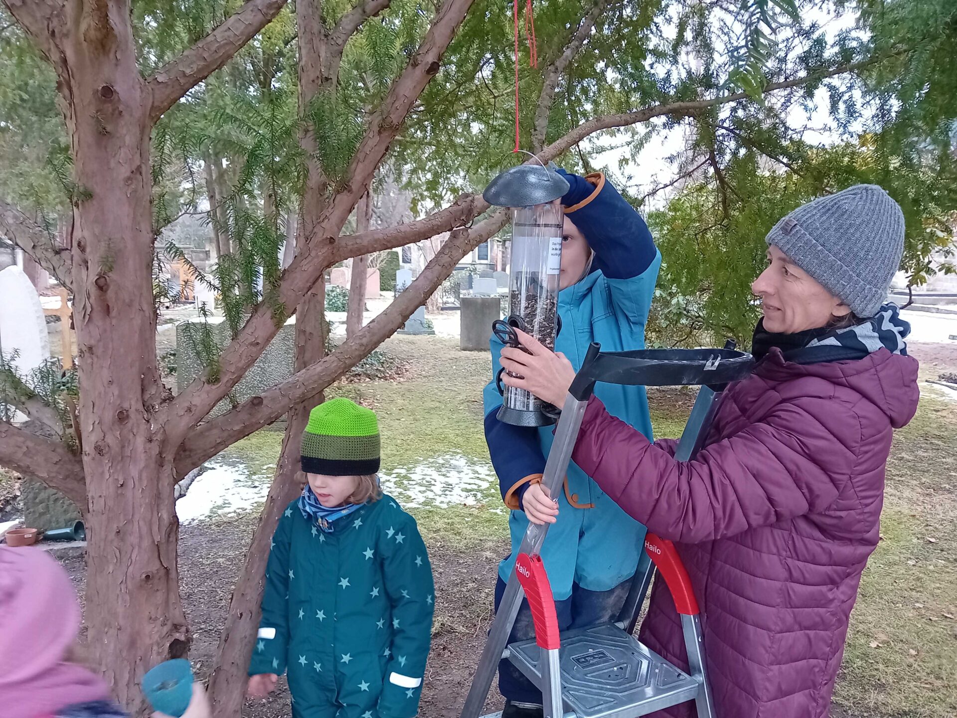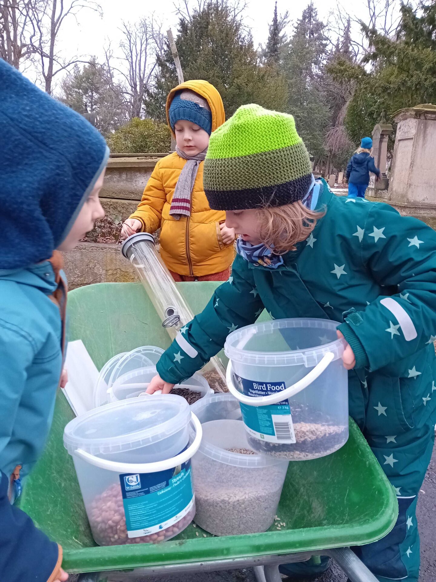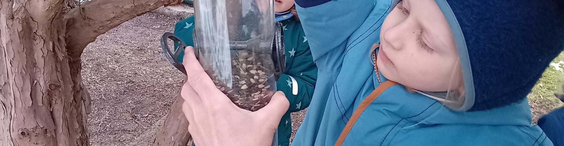 Mit vollen Eimern und viel Eifer machten wir uns auf den Weg, um die Futtersäulen und Stationen „winterfest“ zu machen. Dabei haben die Kinder nicht nur tatkräftig angepackt, sondern auch viel über unsere heimischen Vögel gelernt. Warum ist das Füttern gerade jetzt so wichtig? In der kalten Jahreszeit verbrauchen Vögel enorm viel Energie, um ihre Körpertemperatur zu halten. Da natürliche Nahrungsquellen oft unter Schnee oder Frost verborgen sind, bieten unsere Stationen eine lebenswichtige Extraportion Energie.