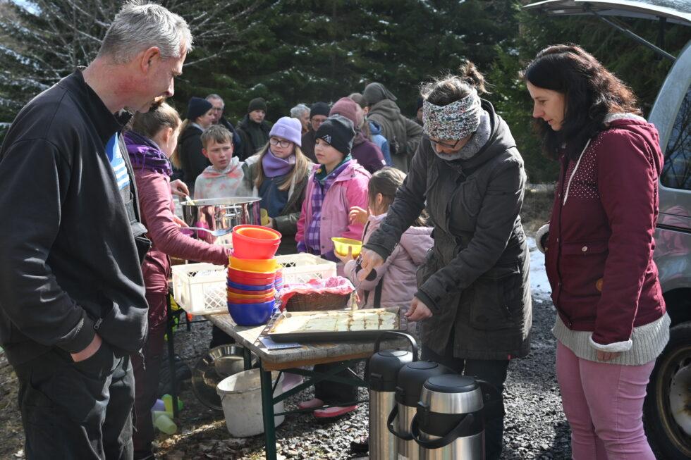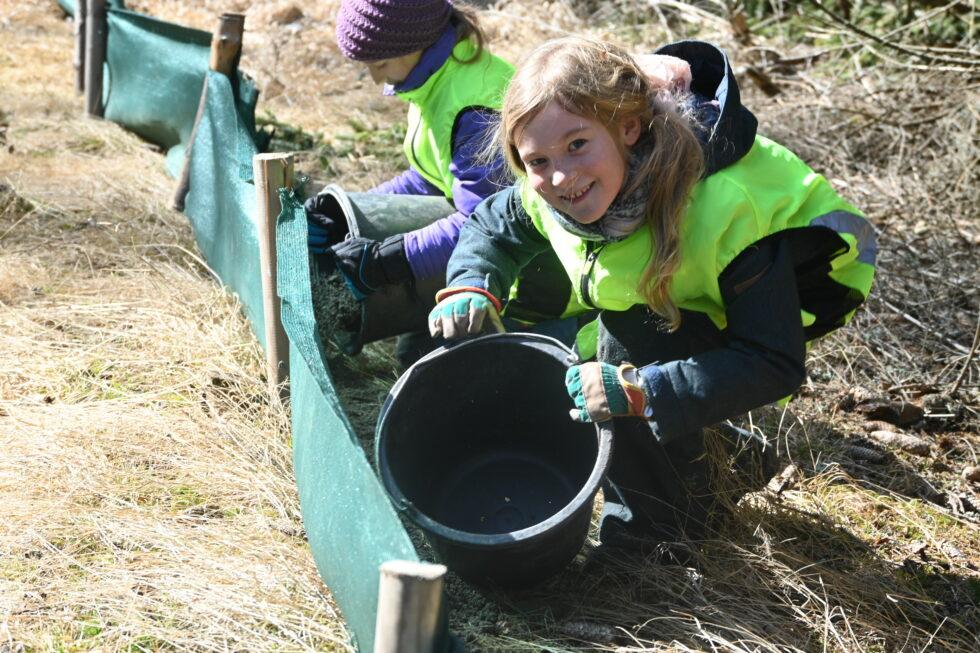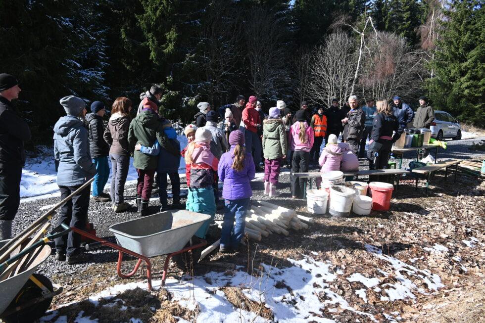 Zum traditionellen Krötenzaun-Aufbau konnten wir am 27. März 2026 wieder zahlreiche Helfer und Helferinnen begrüßen. Bei strahlendem Sonnenschein wurden wieder 400 m Amphibienschutzzaun am Floßteich zwischen Reitzenhain und Satzung errichtet. Die JuNa-Gruppe „Naturforscherclub“ ist seit vielen Jahren fest eingebunden in die Errichtung und Betreuung der Amphibienschutzanlage. 23 Kinder und Jugendliche und 14 Erwachsene unterstützten uns diesmal tatkräftig bei dieser Aktion. Neben den Naturforscherclub-Teilnehmern beider Gruppen (Moorhühner, Zugvögel) waren auch wieder deren Familien und weitere Vereinsmitglieder dabei. Auch bei der Eimerkontrolle in den kommenden Wochen könnt ihr euch wieder beteiligen, es gibt noch einige wenige freie Plätze im Nuudel-Kalender!