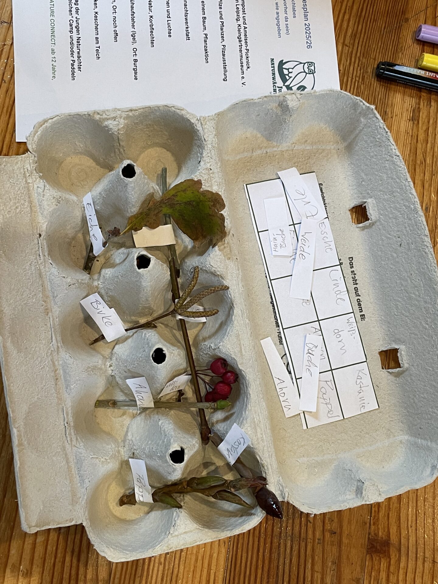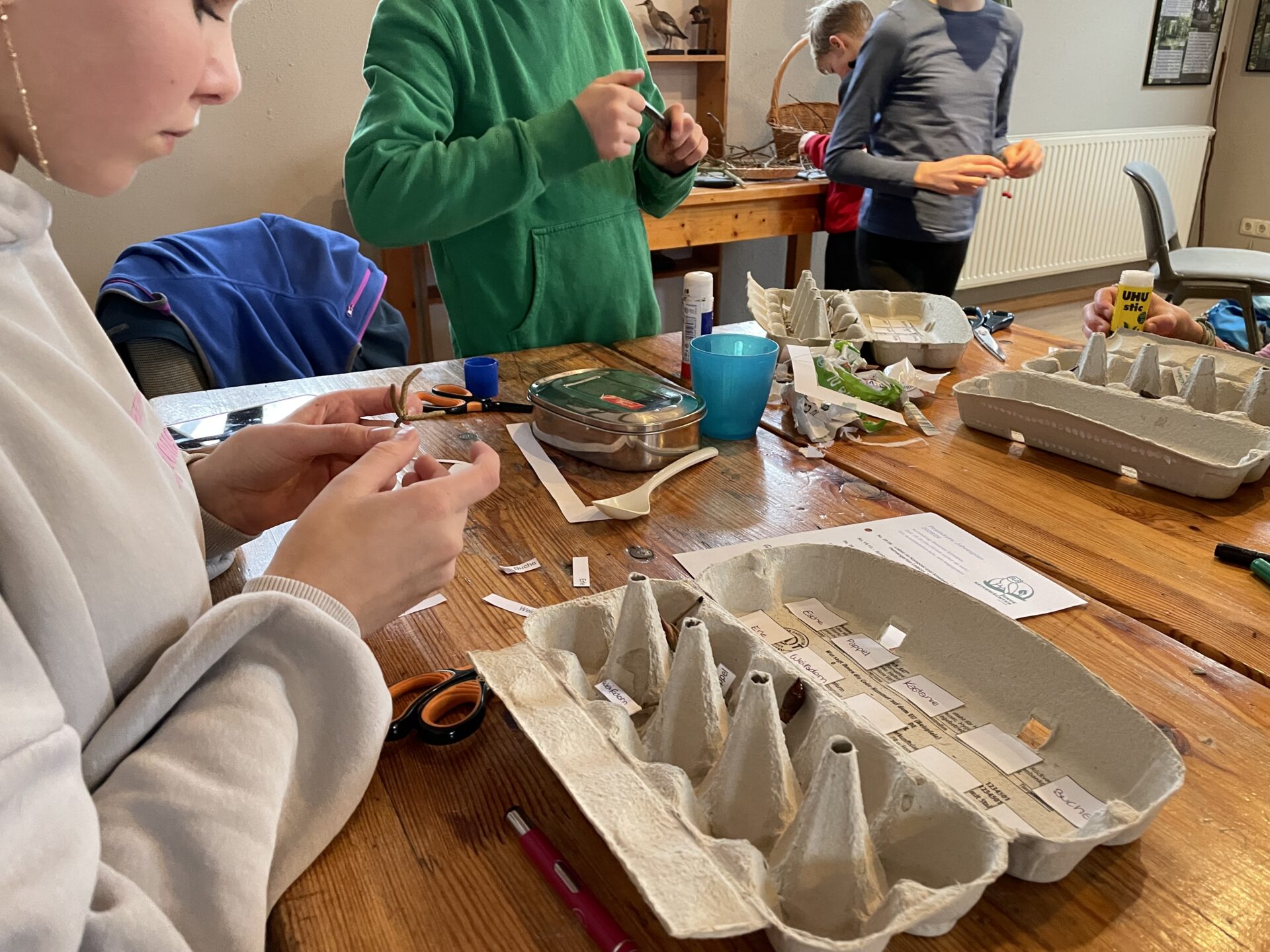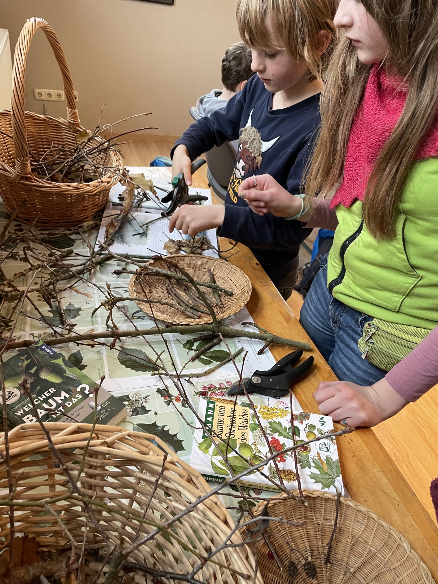 Anschließend gingen die JuNas zurück in die Auwaldstation, brauchten nach einer Mittagspause etwas Erholung von der Wanderung und hörten sich währenddessen eine Geschichte über das Parkgespenst an – den Waldkauz. Jetzt zur Winterzeit sind genau diese Vögel oft am Abend hörbar. Bestimmt werden ein paar mutige JuNas mit den Eltern demnächst einen abendlichen Spaziergang im Wald unternehmen, nur um einmal die Eulen rufen zu hören. Während dieser Hörgeschichte bastelten die JuNas ihre persönliche Botanisiertrommel, ein Gefäß zum Sammeln von Pflanzen. Bevor die Fotografie das Ablichten der Pflanzen direkt am Wuchsort ermöglichte, war das die beliebte Weise, Pflanzen sicher zu transportieren und zu Hause bis auf die Art zu bestimmen. Anschließend wurden diese Funde in einem Herbarium aufbewahrt. Diese Trommel gab es auch im Kleinformat und war zum Anfang des 20. Jahrhundert eine beliebte Geschenkidee für Kinder. Nun können die JuNas mit ihrer Botanisiertrommel, die mit Zweigen, Knospen und teilweise auch den Fruchtständen der jeweiligen Bäume bestückt wurde, die Bäume zu Hause, im Garten oder Park anhand der sichtbaren Merkmale vor Ort bestimmen.