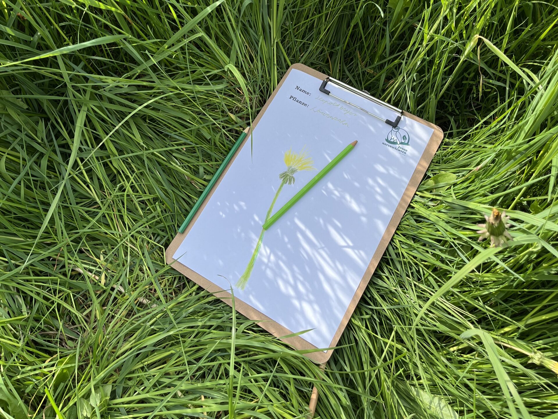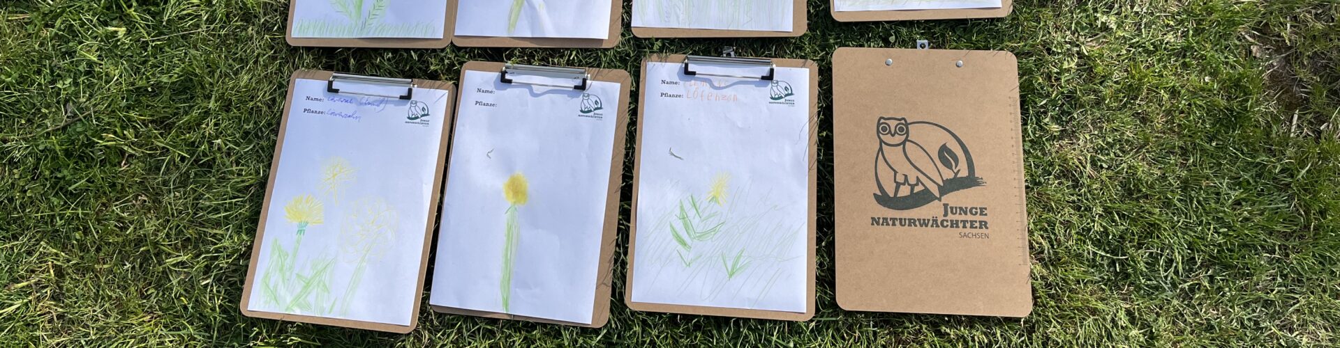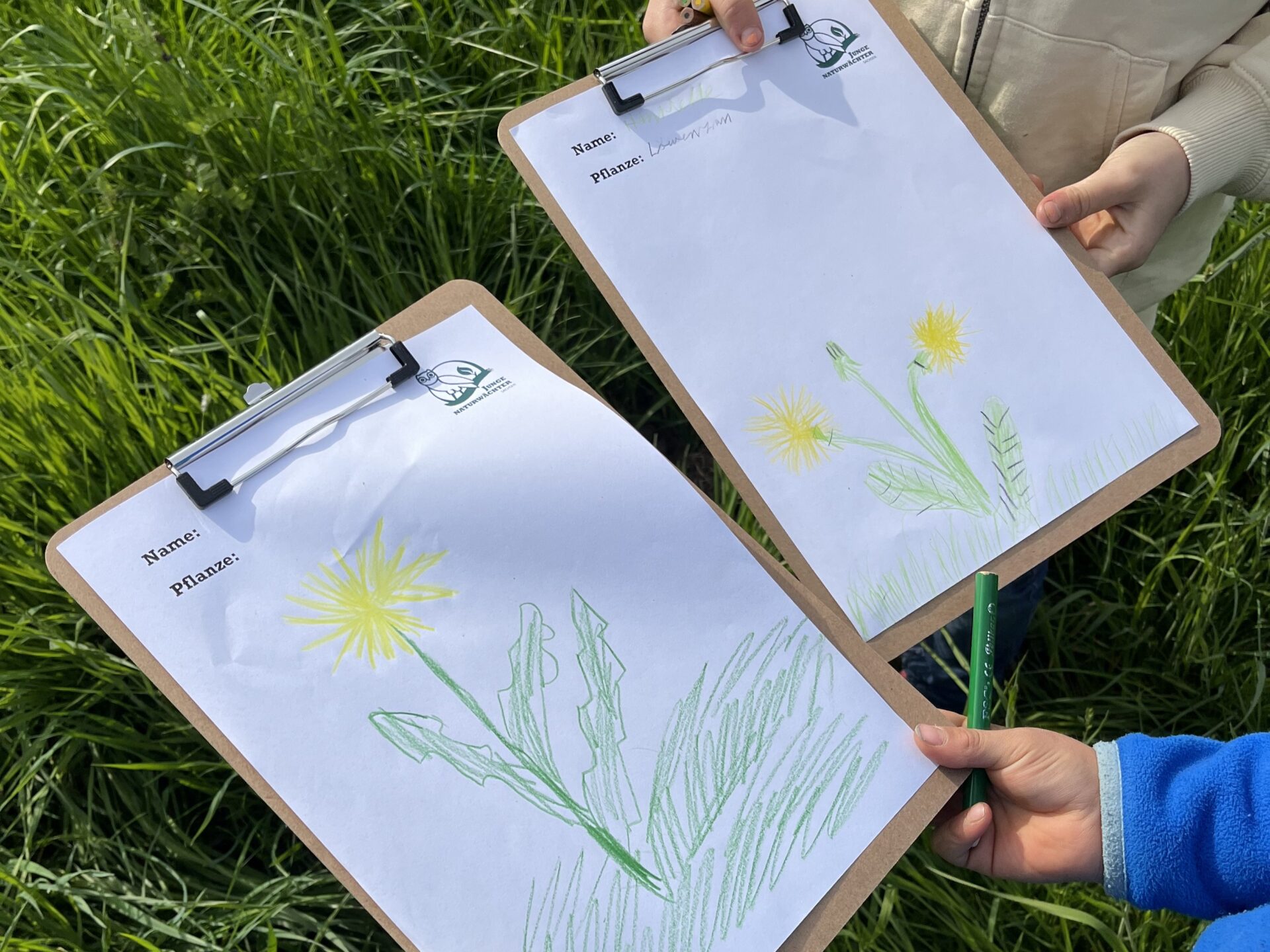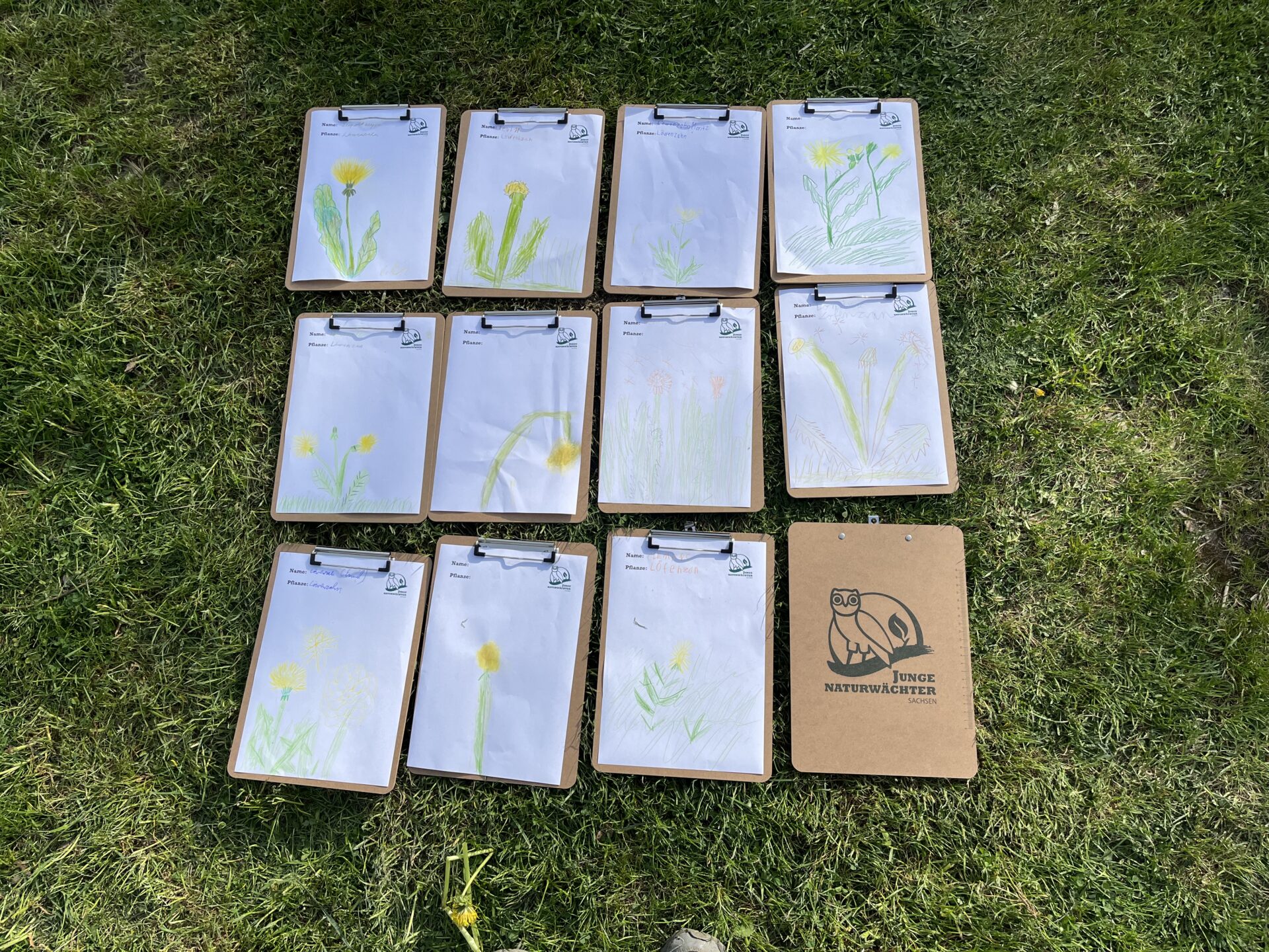 Zuerst durften sich die Kinder eine eigene Löwenzahn-Pflanze auf der Wiese suchen. Mit Klemmbrett und Buntstiften ausgestattet wurde die Pflanze genau beobachtet und zu Papier gebracht. In einer anschließenden Runde präsentierten die Kinder ihre Bilder und berichteten von ihren Beobachtungen.