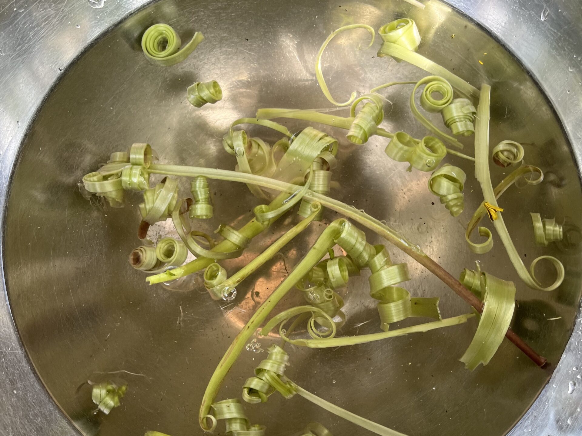 Danach wurde an drei Stationen geforscht: Bei der Station „Kringel-Stängel“ teilten die Kinder den Stängel in lange, dünne Streifen und legten diese in eine Schale mit Wasser. Da sich die Innenseite des Stängels stärker mit Wasser vollsaugt als die Außenseite, bildeten sich dabei lustige Kringel.