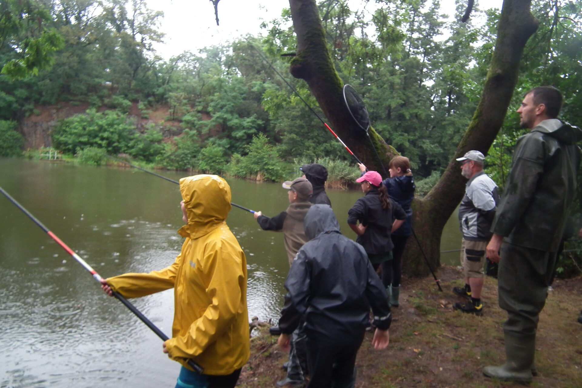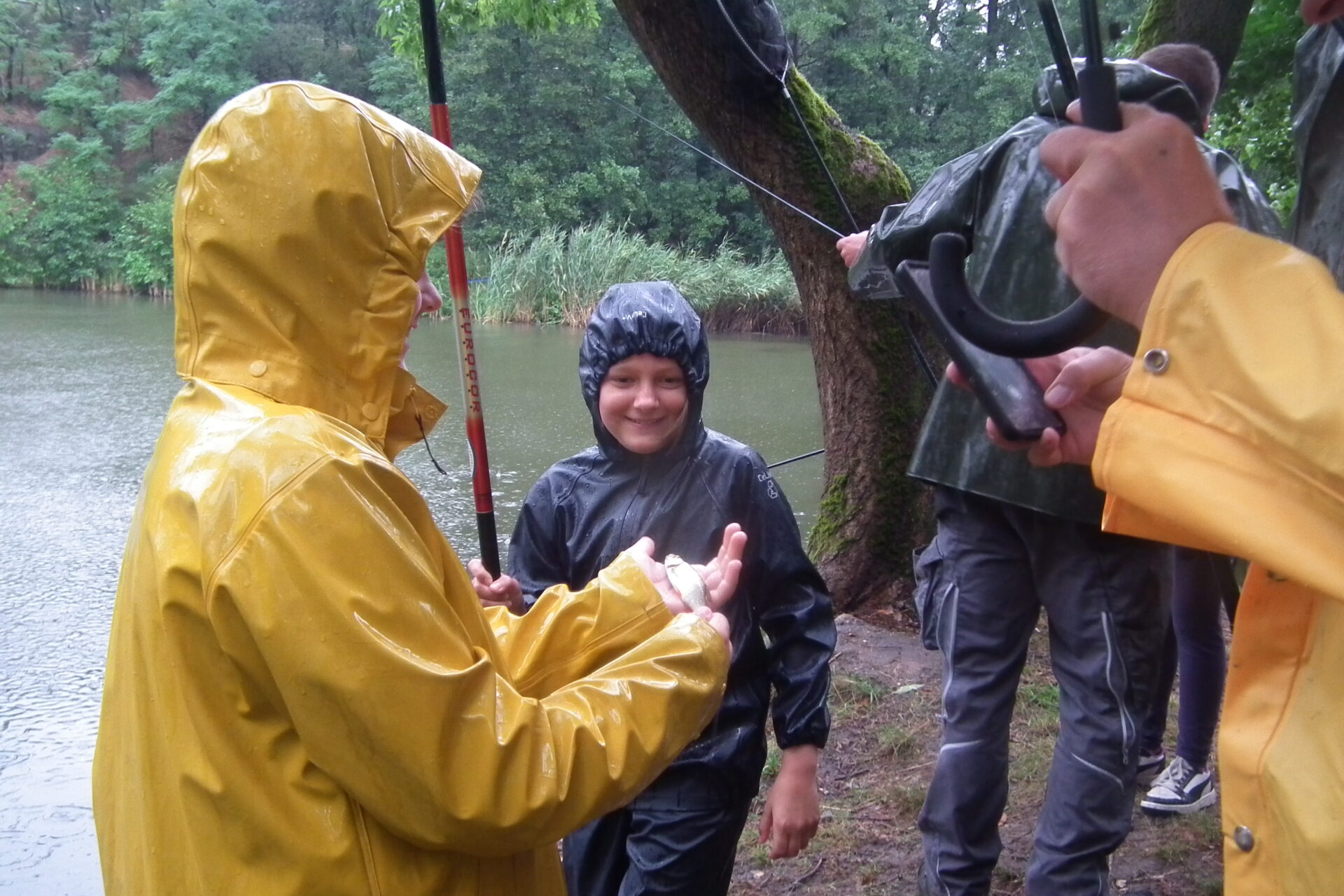 Alle waren mit viel Feuereifer bei der Sache und sehr aufgeregt als plötzlich ein großer Fisch beim Team Fanny und Emma am Haken war. Obwohl der Kescher gleich bereit war, konnten wir den Fisch nicht landen. Schade. Ein kleines Picknick gab uns neue Kraft. Aber die Hoffnung, dass der Starkregen nachlässt wurde leider nicht erfüllt. So ging der Tag nach einer kurzen Abschlussangelrunde viel zu schnell vorbei. Unsere gefangenen Fische kamen alle wieder ins Gewässer, sie waren noch klein. Wir nehmen uns schon mal einen Besuch in der Ausstellung Fischwelt Leipzig vor und bedanken uns bei Jacob Kirsch und Micha Häußler für die vielen Infos und die Hilfe, kurzum, für den tollen Vormittag und die schönen Erlebnisse.