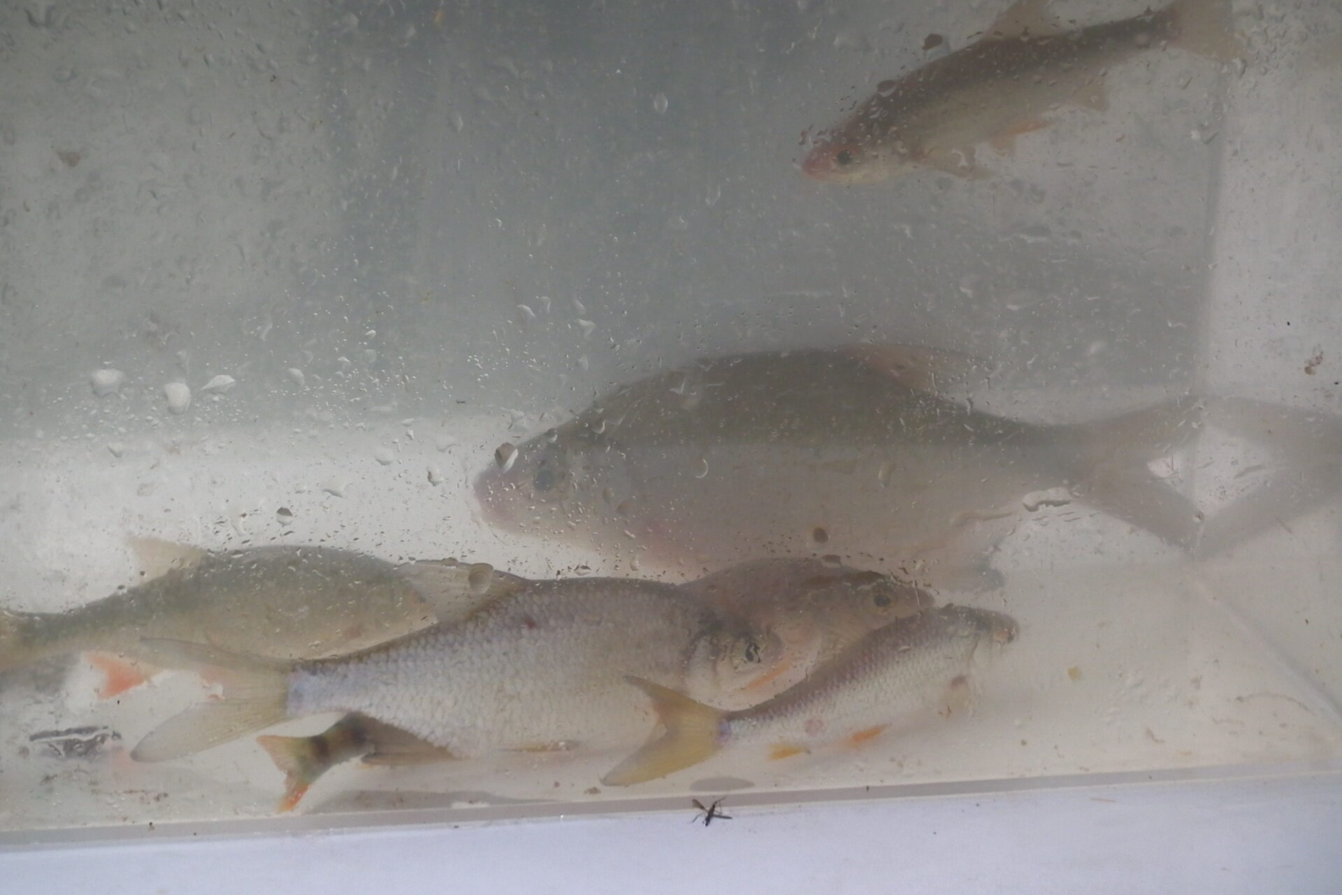 Gemeinsam mit Jacob Kirsch und Micha Häußler trafen wir uns schon 8.00 Uhr am Anglerparadies in Oschatz. Nach der Begrüßung und Einführung konnten wir dann mit Stippruten in Zweierteams das Angeln ausprobieren. Der erste Fisch ließ nicht lange auf sich warten. Alle Angelteams hatten Erfolg. Insgesamt 5 Arten haben wir gefangen: Flußbarsch, Plötze, Rotfeder, Güster und Moderlieschen. Wir konnten die einzelnen Arten im kleinen Aquarium genauer Anschauen und die Unterschiede sehen. Dazu erklärte uns Micha Häußler auch noch viel.