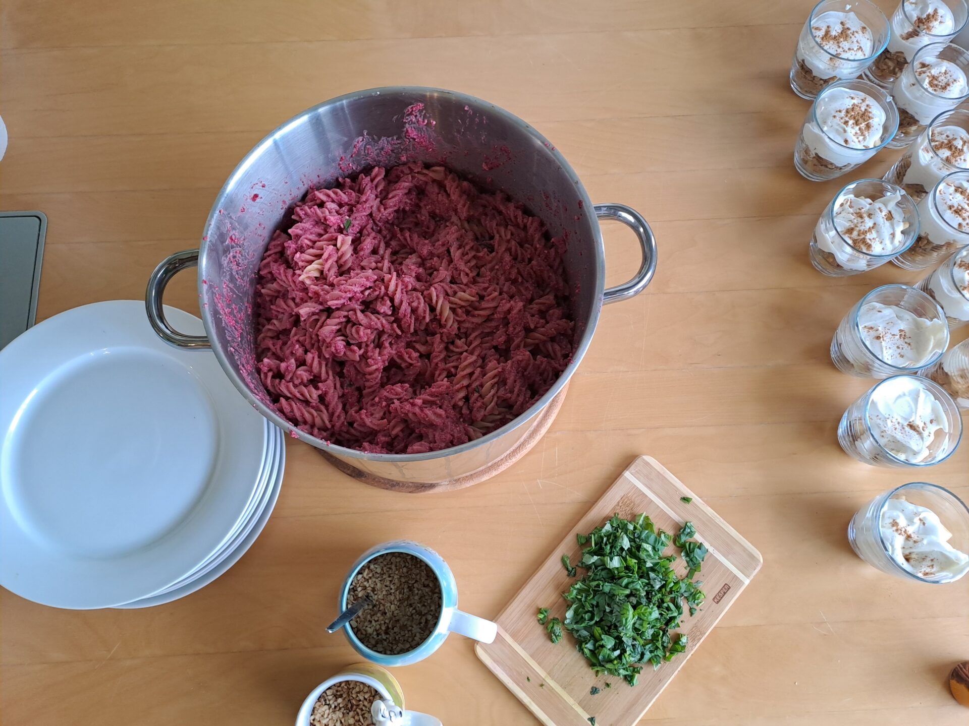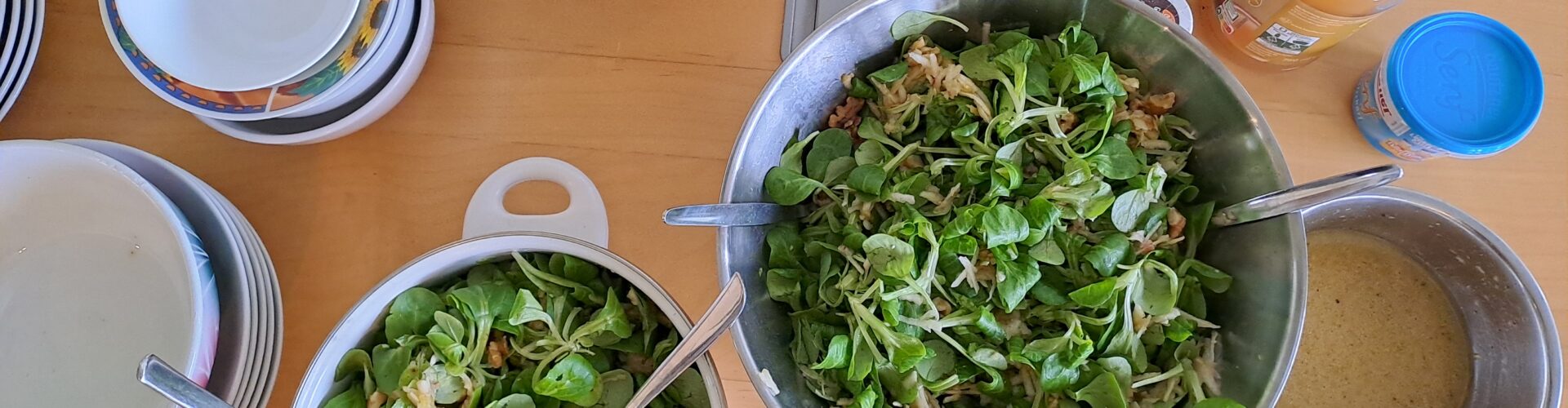 Dann ging es an die Schneidebretter! In drei Gruppen zauberten wir: Feldsalat mit Apfel und Walnüssen, Rote-Bete-Feta-Vollkornpasta sowie Winterliches Knusperjoghurt. Und was sollen wir sagen? Mmmh – einfach super lecker!