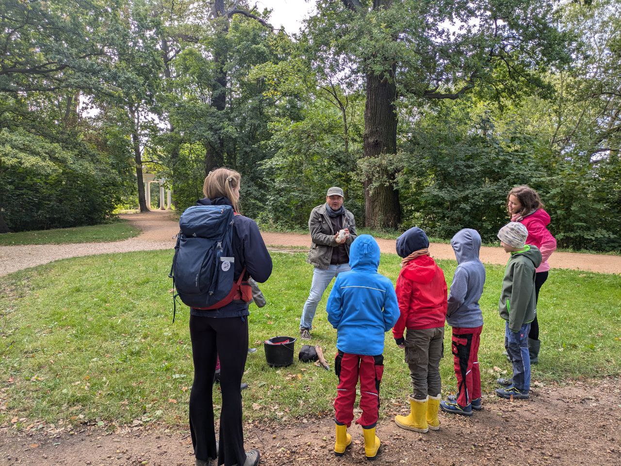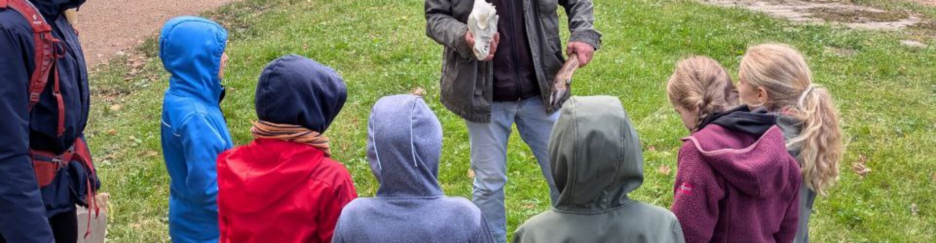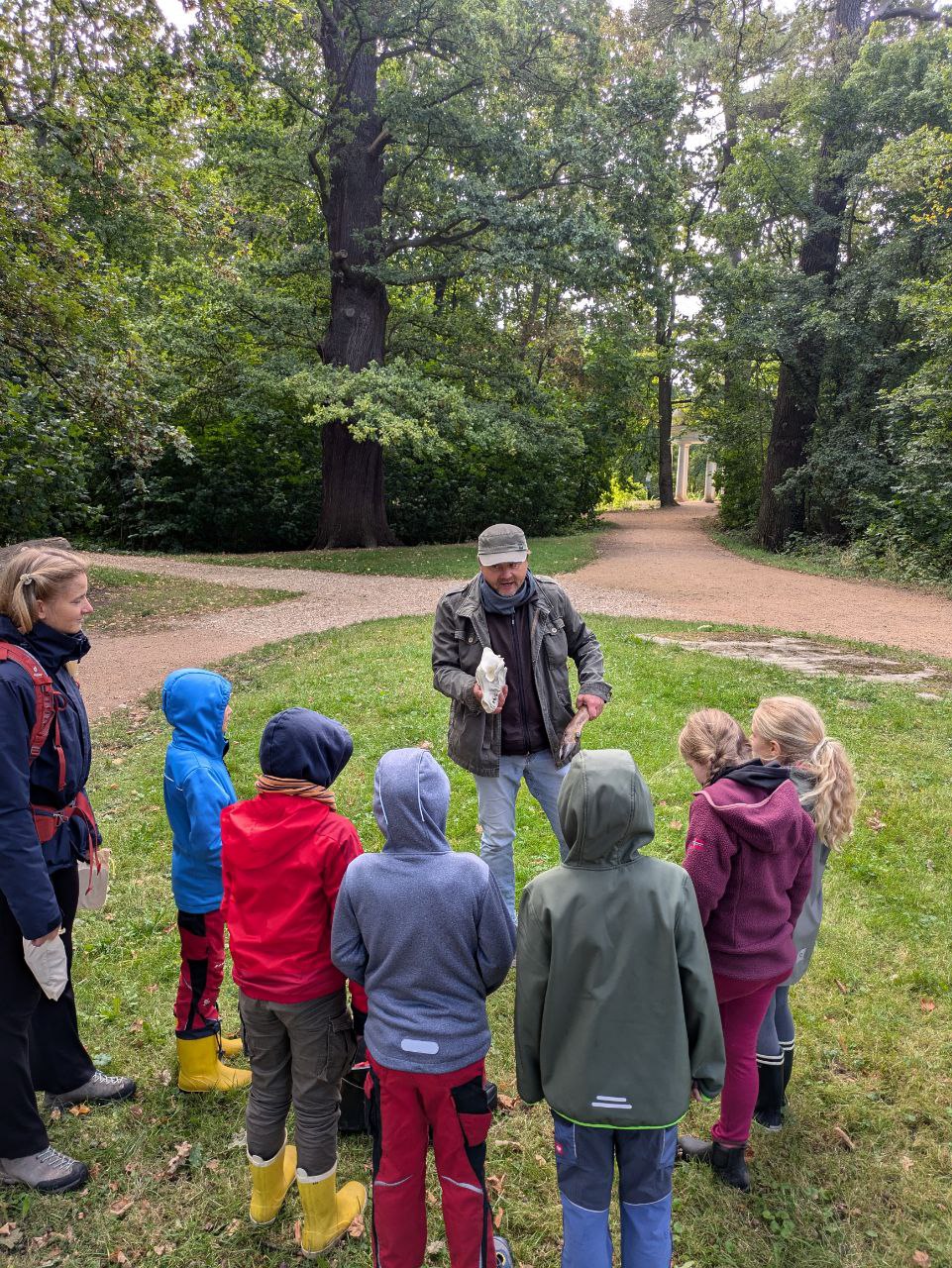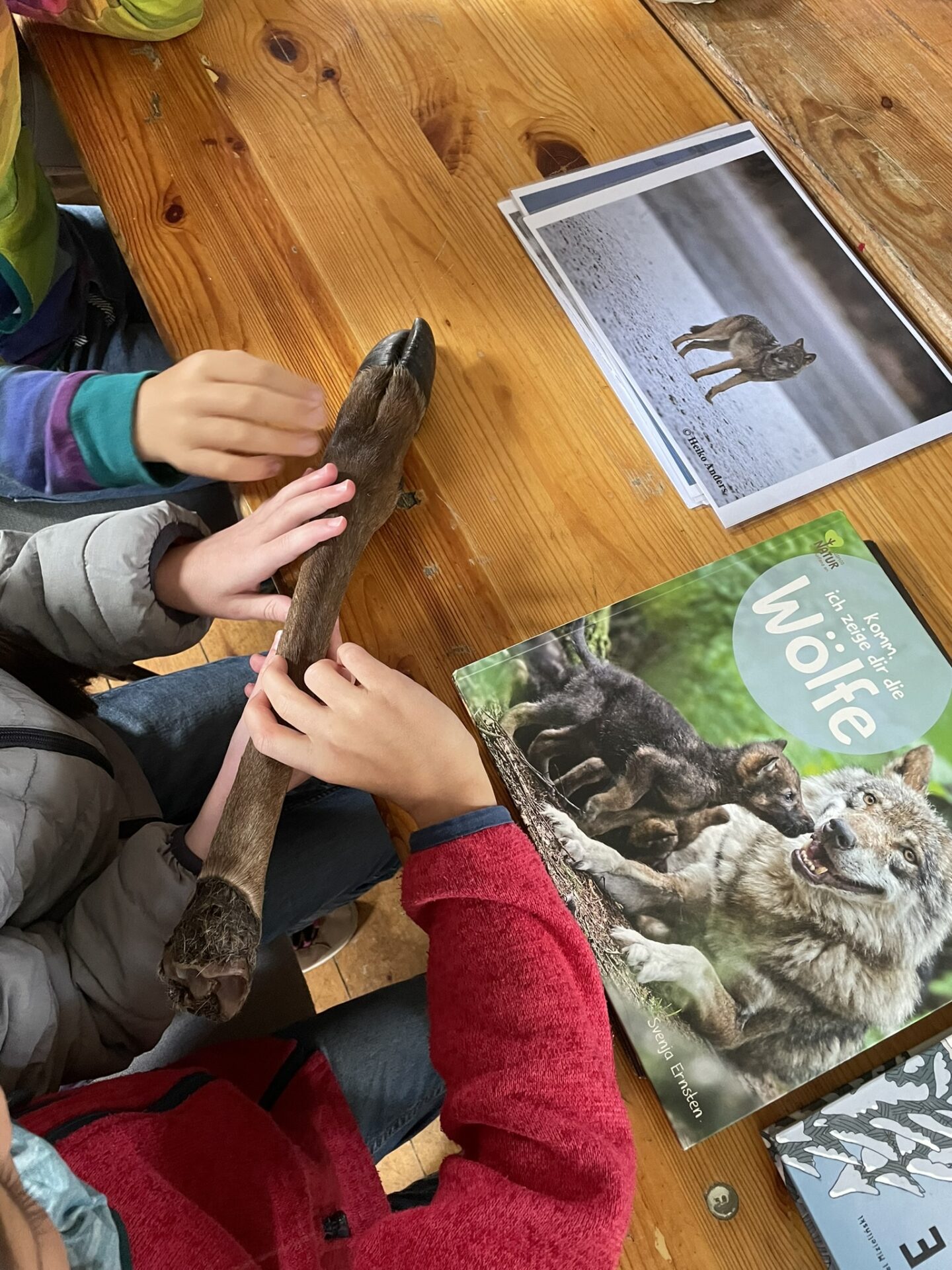 Der Tag begann mit einer Fühlirunde, geleitet von unserer lieben Weinbergschnecke Fritzi Schleimfuß. Hier konnte jede/r von uns erzählen, was sie/ihn gerade beschäftigt und wie es ihr/ihm geht. Danach folgte eine Umfrage zum Thema Wolf. Wir sollten überlegen, was wir über den Wolf denken: Haben wir oder unsere Eltern Angst, wenn wir alleine im Wald unterwegs sind? Wie fühlen wir uns, wenn wir an Wölfe denken? So hat jeder seine eigene Sichtweise eingebracht und unsere Diskussionen waren bereits zu Beginn sehr lebhaft. Im Anschluss führte uns Jan in die Welt der Wolfsforschung ein. Wir lernten, wie man mit Wildtierkameras arbeitet, welche Aufnahmen sie liefern können und welche Besonderheiten Schädel, Gebiss und Losungen (Kot) von Wölfen aufweisen. Es war zwar kühl, aber im gemütlichen Kaminzimmer konnten wir uns bei Früchtetee aufwärmen. Dabei zeigte uns Jan Bilder von den Wolfsgebieten in Sachsen und erklärte uns, wie man Wölfe von Hunden unterscheiden kann. Besonders spannend war der Einblick in die Kommunikation innerhalb eines Wolfsrudels, die wir z.T. nachgestellt haben. Nachdem uns wieder warm geworden ist, machten wir uns auf den Weg in den Schlosspark. Dort überlegten wir gemeinsam, welche Tiere der Wolf jagt und welche Gefahren dabei auf ihn zukommen. In den Losungen entdeckten wir sogar Fell- und Federreste, die Hinweise auf seine Beute gaben. Alina las uns eine kurze Geschichte über das Markieren und Verteidigen von Revieren vor. Danach wurden wir selbst zu zwei Wolfsrudeln – mit Fähe, Rüde, Jährling und Welpe. Unsere Aufgabe war es, anhand von Gerüchen unsere Reviere zu finden und die Nahrung vor dem anderen Rudel zu verteidigen. Das war eine echte Herausforderung, denn Taktik und Teamarbeit waren gefragt! Ein drittes Rudel kam ins Spiel, als die „Jährlinge“ ihr Rudel verlassen mussten und ein eigenes Territorium beanspruchten. Am Ende dieses Spiels waren wir alle ordentlich ausgetobt und machten es uns für die Mittagspause wieder im Kaminzimmer gemütlich.