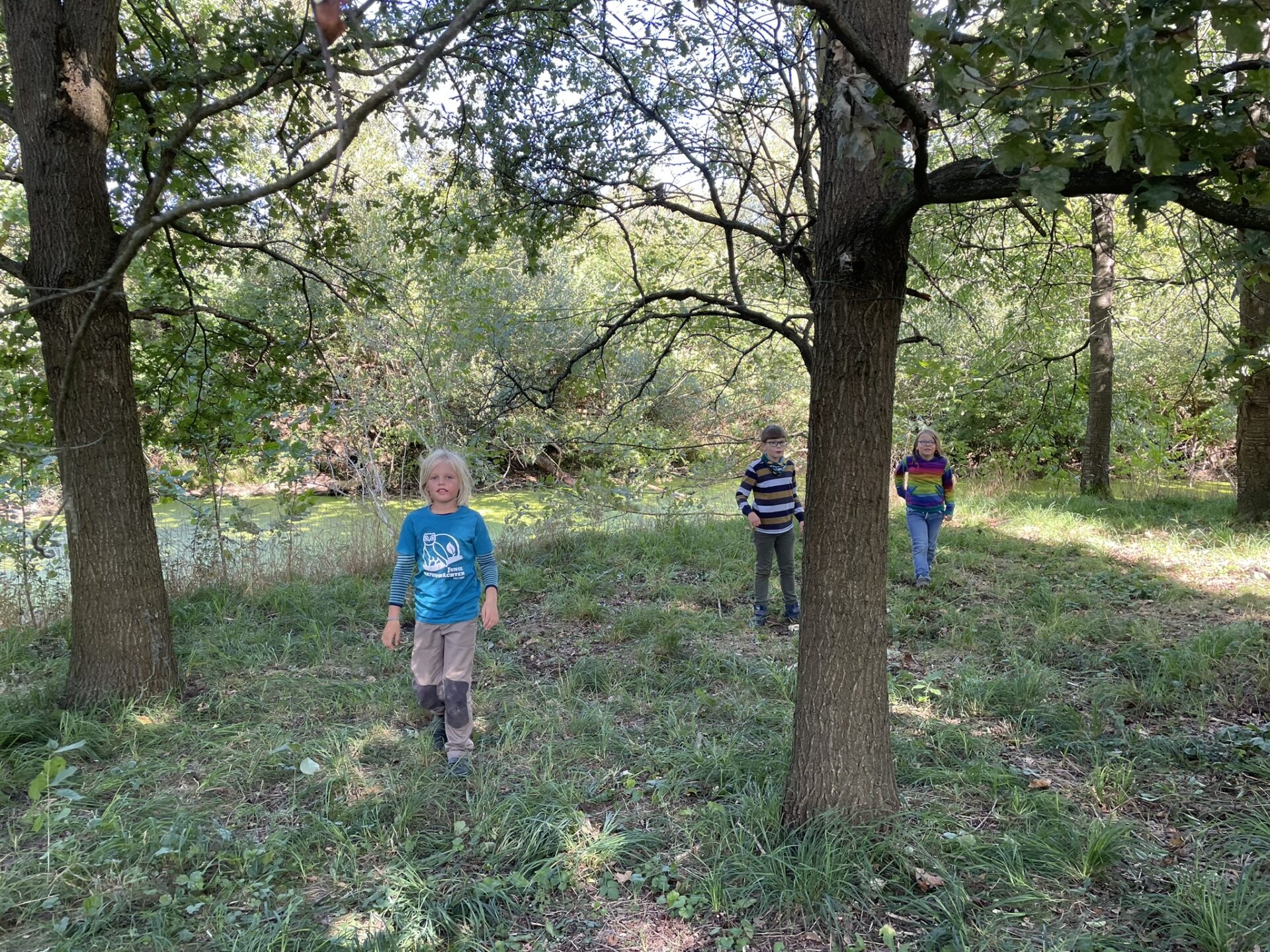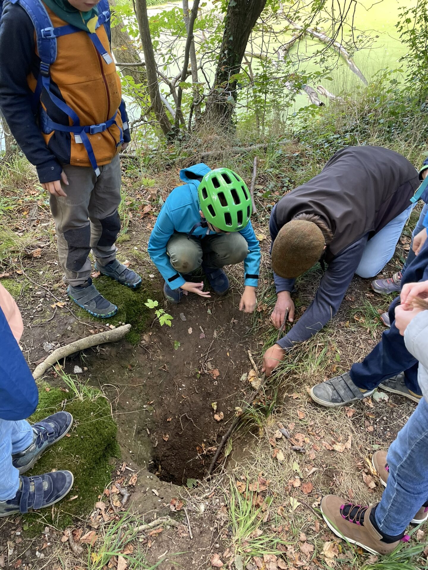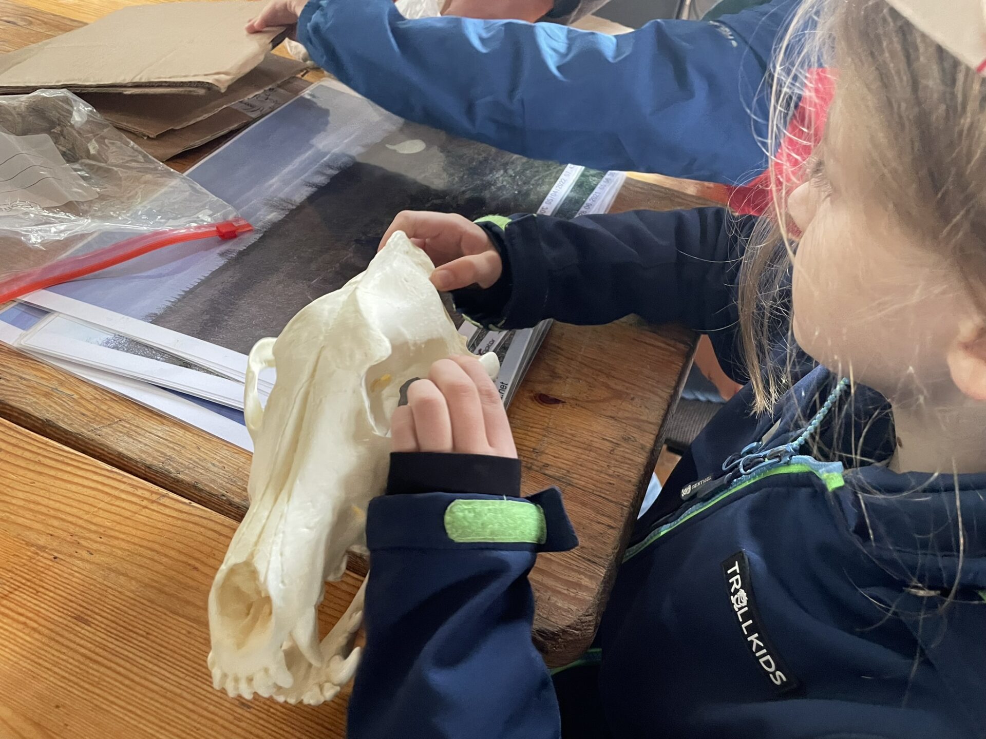 Der Tag begann mit einer Fühlirunde, geleitet von unserer lieben Weinbergschnecke Fritzi Schleimfuß. Hier konnte jede/r von uns erzählen, was sie/ihn gerade beschäftigt und wie es ihr/ihm geht. Danach folgte eine Umfrage zum Thema Wolf. Wir sollten überlegen, was wir über den Wolf denken: Haben wir oder unsere Eltern Angst, wenn wir alleine im Wald unterwegs sind? Wie fühlen wir uns, wenn wir an Wölfe denken? So hat jeder seine eigene Sichtweise eingebracht und unsere Diskussionen waren bereits zu Beginn sehr lebhaft. Im Anschluss führte uns Jan in die Welt der Wolfsforschung ein. Wir lernten, wie man mit Wildtierkameras arbeitet, welche Aufnahmen sie liefern können und welche Besonderheiten Schädel, Gebiss und Losungen (Kot) von Wölfen aufweisen. Es war zwar kühl, aber im gemütlichen Kaminzimmer konnten wir uns bei Früchtetee aufwärmen. Dabei zeigte uns Jan Bilder von den Wolfsgebieten in Sachsen und erklärte uns, wie man Wölfe von Hunden unterscheiden kann. Besonders spannend war der Einblick in die Kommunikation innerhalb eines Wolfsrudels, die wir z.T. nachgestellt haben. Nachdem uns wieder warm geworden ist, machten wir uns auf den Weg in den Schlosspark. Dort überlegten wir gemeinsam, welche Tiere der Wolf jagt und welche Gefahren dabei auf ihn zukommen. In den Losungen entdeckten wir sogar Fell- und Federreste, die Hinweise auf seine Beute gaben. Alina las uns eine kurze Geschichte über das Markieren und Verteidigen von Revieren vor. Danach wurden wir selbst zu zwei Wolfsrudeln – mit Fähe, Rüde, Jährling und Welpe. Unsere Aufgabe war es, anhand von Gerüchen unsere Reviere zu finden und die Nahrung vor dem anderen Rudel zu verteidigen. Das war eine echte Herausforderung, denn Taktik und Teamarbeit waren gefragt! Ein drittes Rudel kam ins Spiel, als die „Jährlinge“ ihr Rudel verlassen mussten und ein eigenes Territorium beanspruchten. Am Ende dieses Spiels waren wir alle ordentlich ausgetobt und machten es uns für die Mittagspause wieder im Kaminzimmer gemütlich.