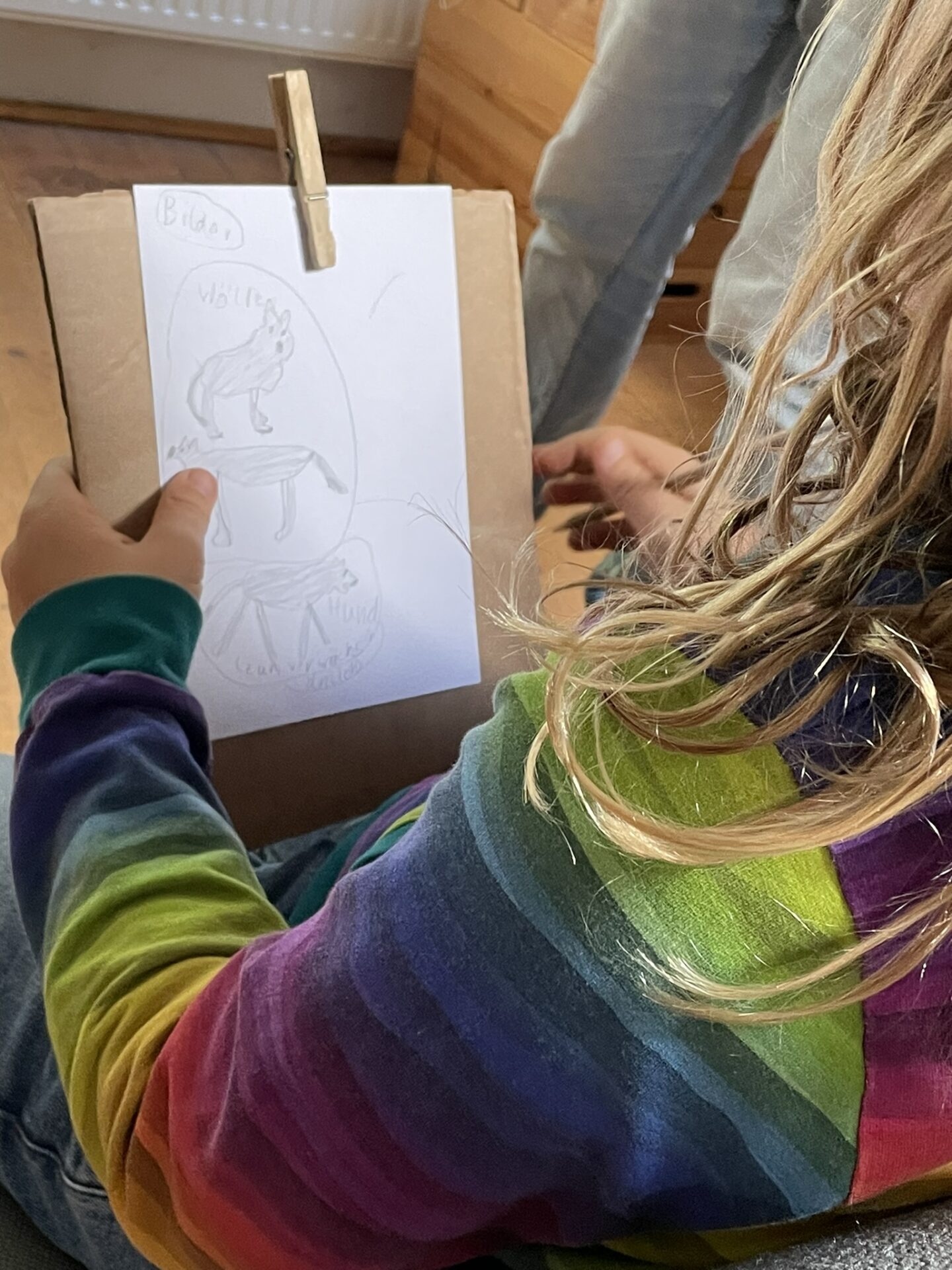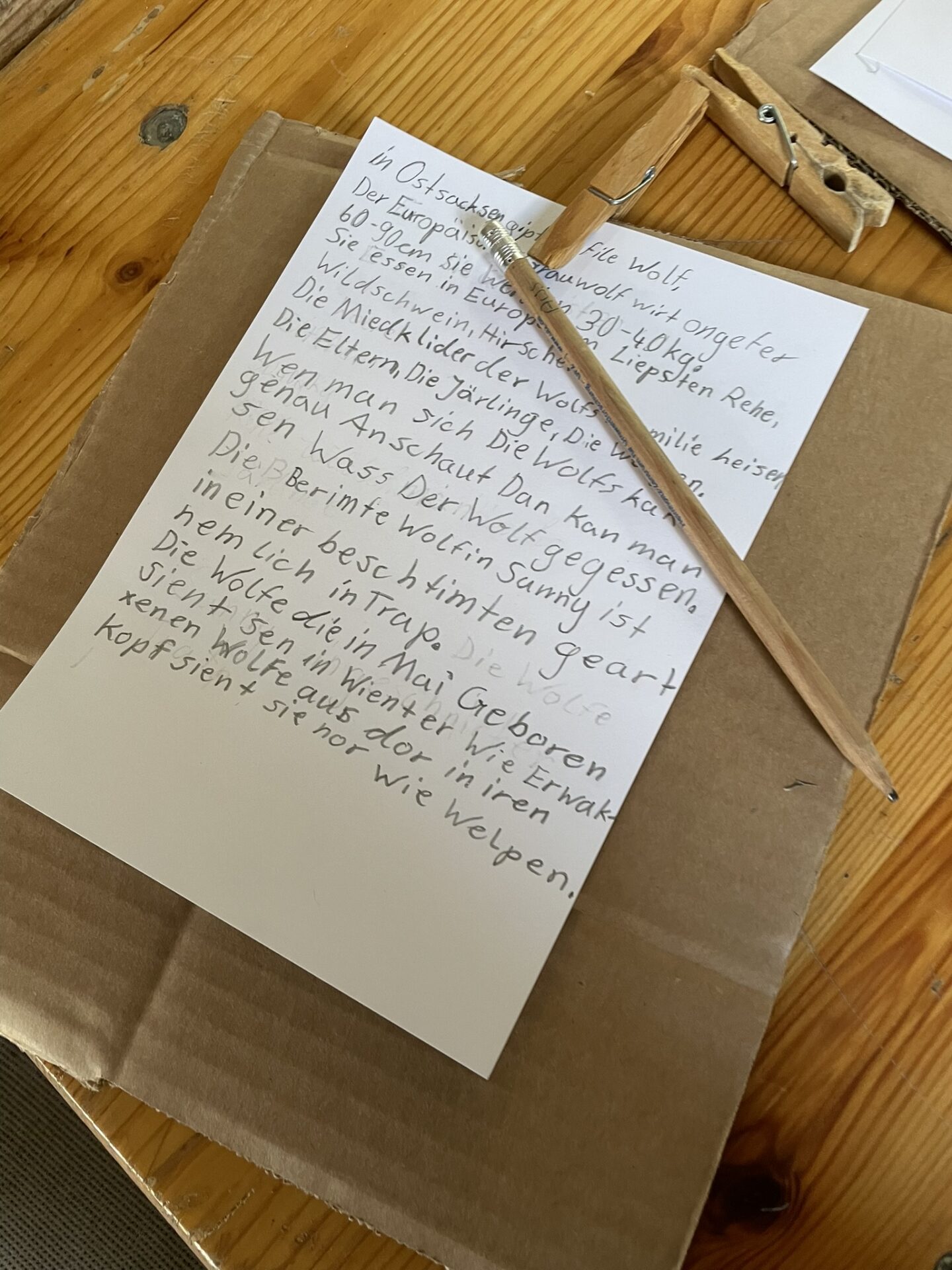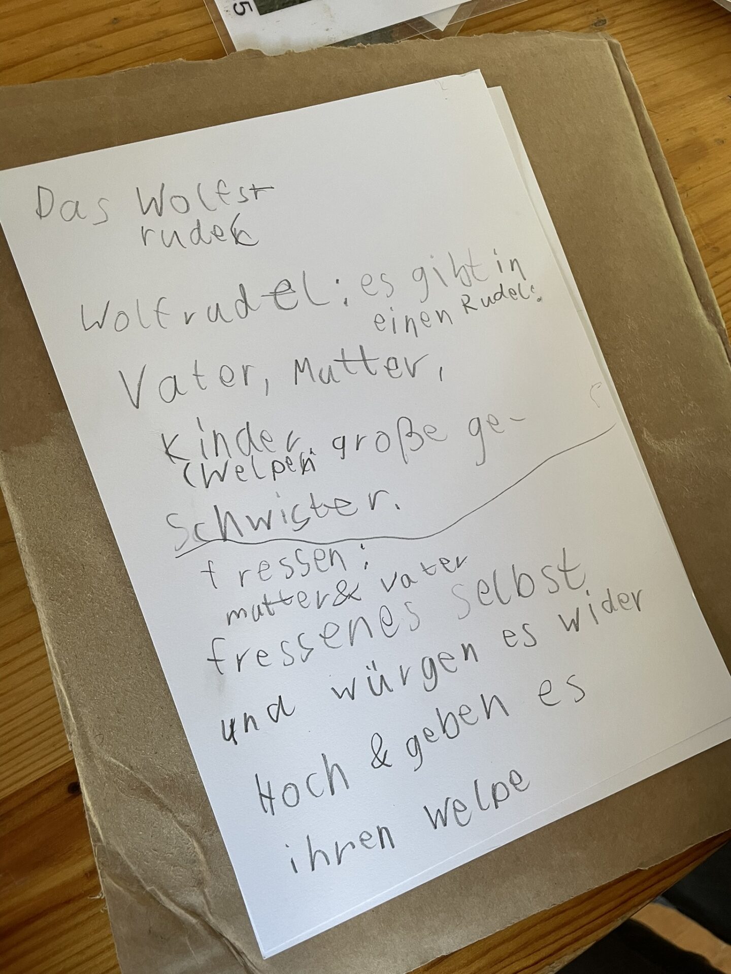 Am Ende des Tages machten wir noch unsere Abschlussrunde, in der jede/r sagen konnte, was ihr/ihm gefallen oder nicht gefallen hat. Schnell wurde klar: Wir waren heute wie eine richtige Wolfsfamilie. Wir haben uns unterstützt, ab und zu ein wenig gezankt, aber am Ende wieder vertragen – wie es in einem Rudel eben so ist.
