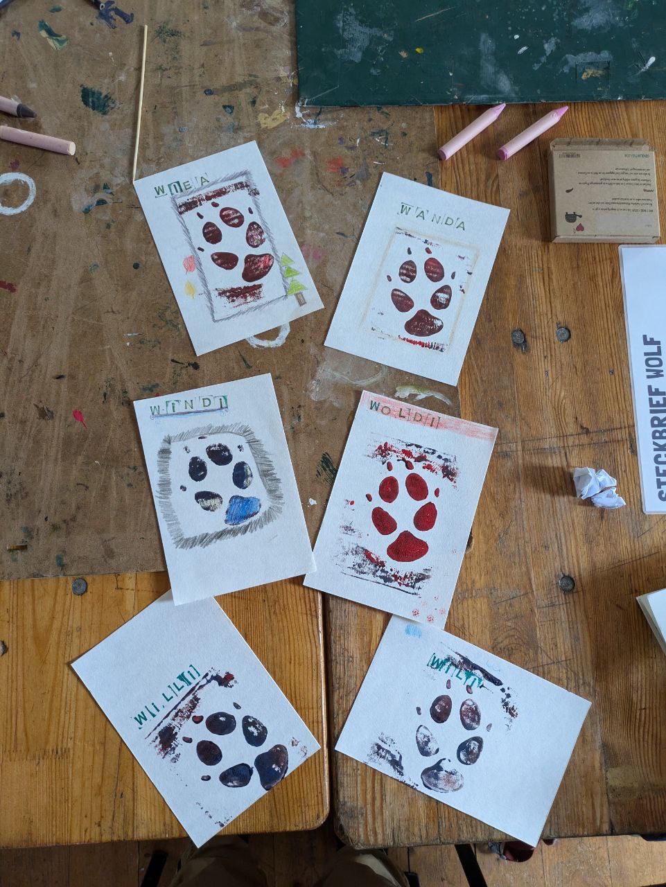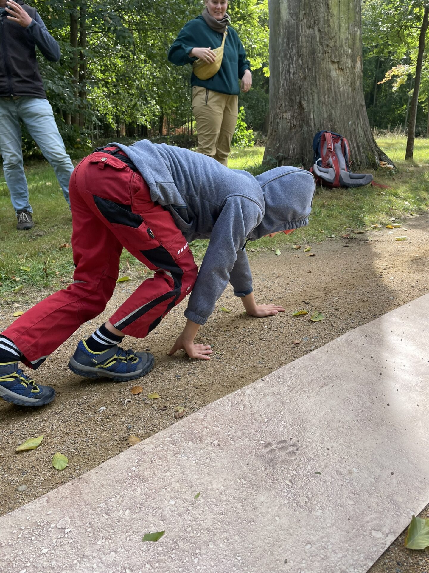 Nach dem Mittagessen wurde es ruhiger. Wir bastelten und jede/r durfte einen Pfotenabdruck vom Wolf stempeln. Dazu überlegten wir uns passende Namen für unsere Wölfe, die alle mit dem Buchstaben „W“ beginnen sollten. Auch die Frage, warum der Wolf „Europäischer Grauwolf“ heißt, obwohl sein Fell so viele verschiedene Farben hat, wurde mit selbst gestalteten Fellkreiseln geklärt. Gestärkt und ausgeruht zog es uns dann wieder nach draußen in die Sonne. Dort lernten wir, wie man Wolfsspuren von Hunde- und Fuchsspuren unterscheiden kann und welche Gangarten Wölfe besitzen. Wir versuchten selbst, auf allen Vieren in einer geraden Linie zu laufen – wie die Wölfe im sogenannten „geschnürten Trab“. Zum Abschluss wollten wir herausfinden, wie Wölfe miteinander durchs heulen kommunizieren. Mit verbundenen Augen versuchten wir, uns durch Rufen wiederzufinden, während die anderen darauf achteten, dass niemand stolpert oder gegen einen Baum läuft.