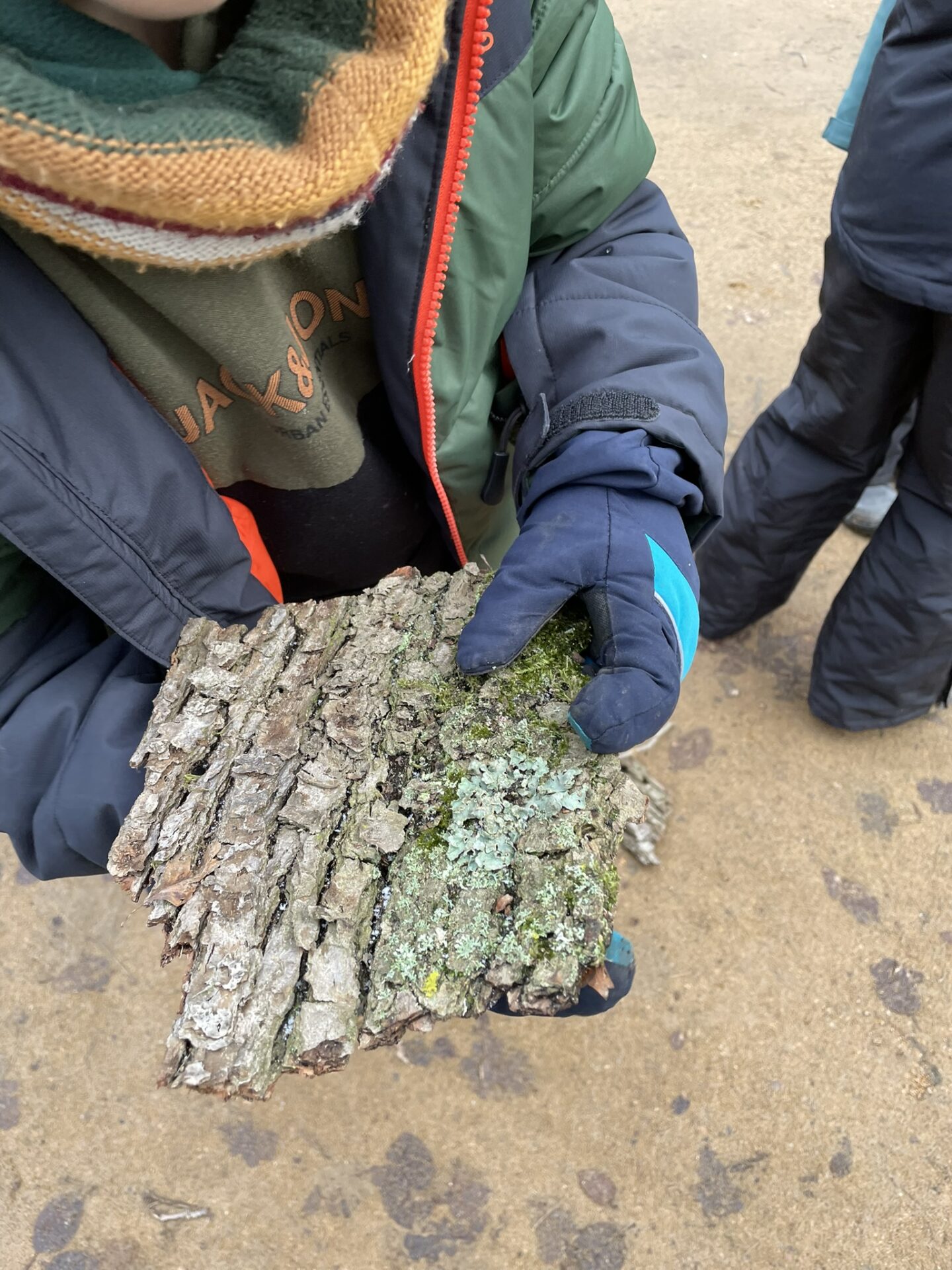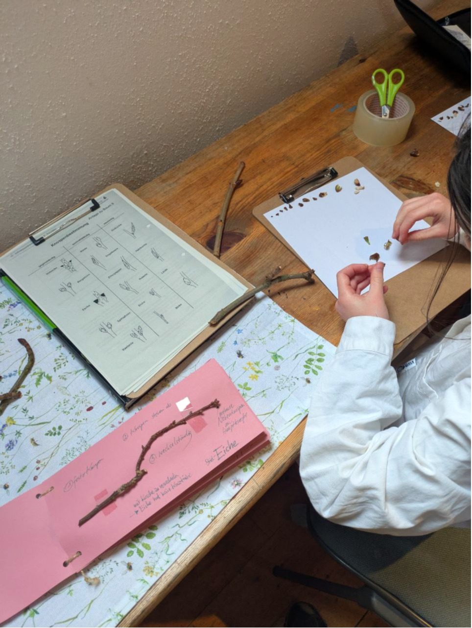 Nach dieser ausgiebigen Bewegung hatten alle Zeit und Konzentration, um sich die mitgebrachten Zweige verschiedener Bäume anzuschauen. Nun sollten sie in Zweiergruppen zwei gleiche Zweige aussuchen und diese beschreiben. Hierbei haben die JuNa schon einige Fachbegriffe eigenständig genutzt und neue hinzugewonnen. Sie betrachteten Wuchsform, Stand der Knospen und Farbe. Die Lentizellen wurden verglichen sowie die Knospenschuppen und deren Anordnung.