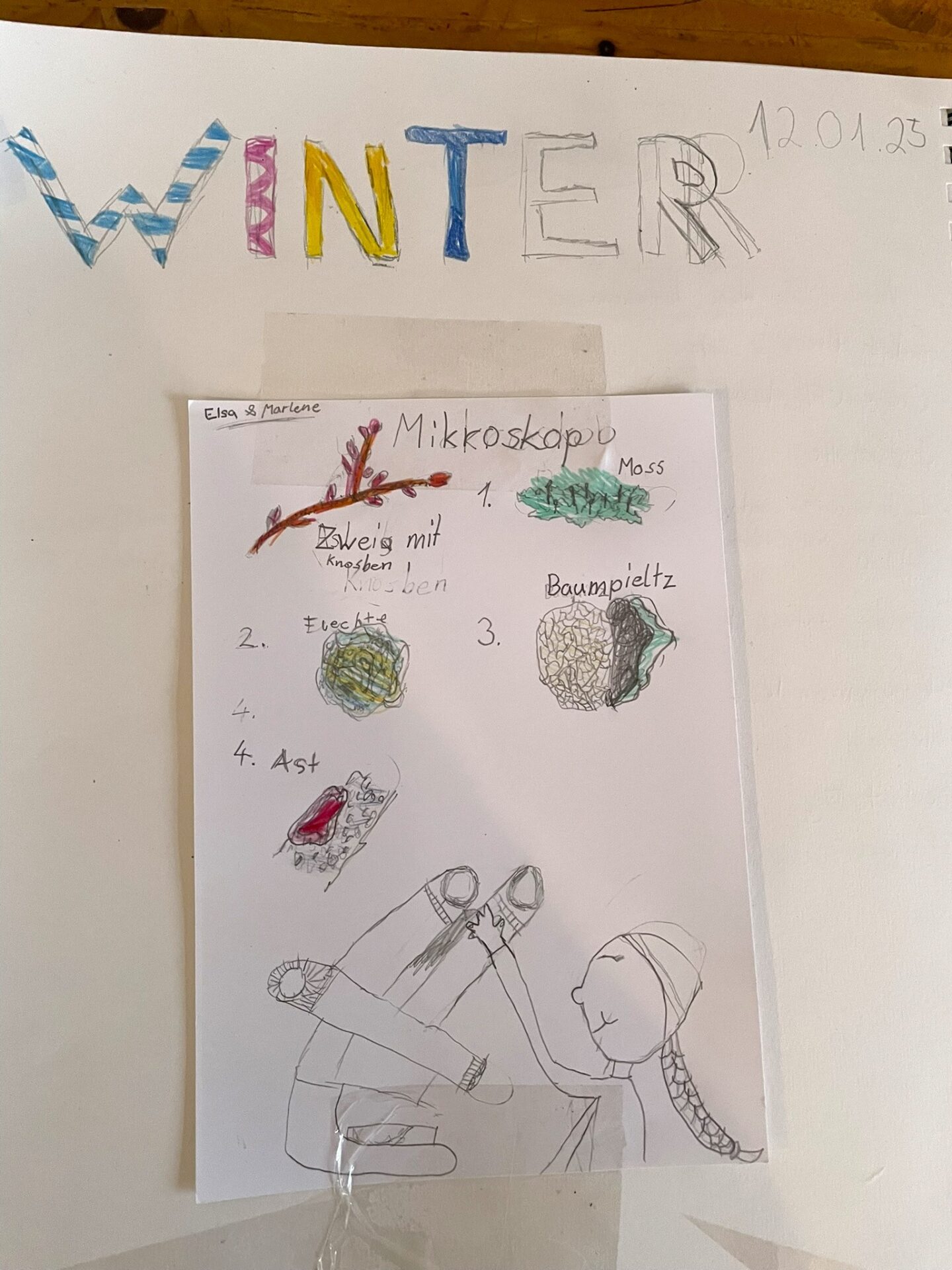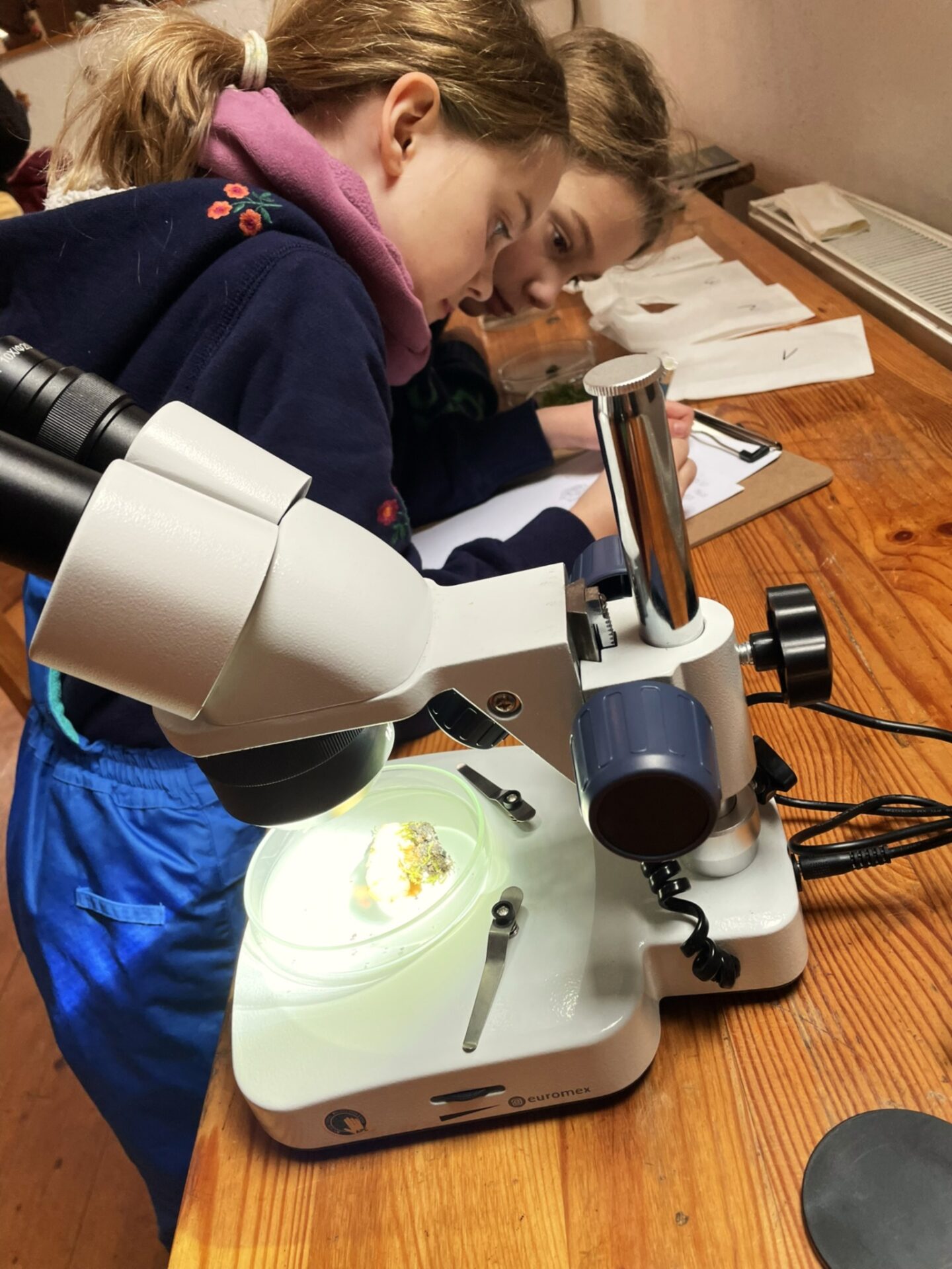 Nach der Stunde kehrten die JuNa zurück in die Auwaldstation, um den Nachmittag mit dem Stereomikroskop die kleinen Lebensformen zu betrachten. Zur Auswahl waren Knospen verschiedener Zweige, Flechten, ein Baumpilz und einige Präparate. In Zweiergruppen konnte jedes Kind seinen eigenen Interessen nachgehen, abzeichnen und Notizen zu den gesehenen Details unter der Lupe machen. Im JuNa-Forscherbuch wurde eine neue Seite gestaltet und dabei die gemachten Beobachtungen aufgeschrieben. An einem Tisch konnten die Kinder Knospen mit einer Pinzette vorsichtig auseinandernehmen und jedes einzelne Teil auf ein Blatt kleben. Andere haben sich mehr dem auseinandernehmen von Gewölle zugewandt oder Knochen mit der Lupe untersucht. Die Wuchsformen der Zweige und die Besonderheiten verschiedener Baumknospen konnten mithilfe Bestimmungsliteratur genauer in ihren Arten unterschieden werden.