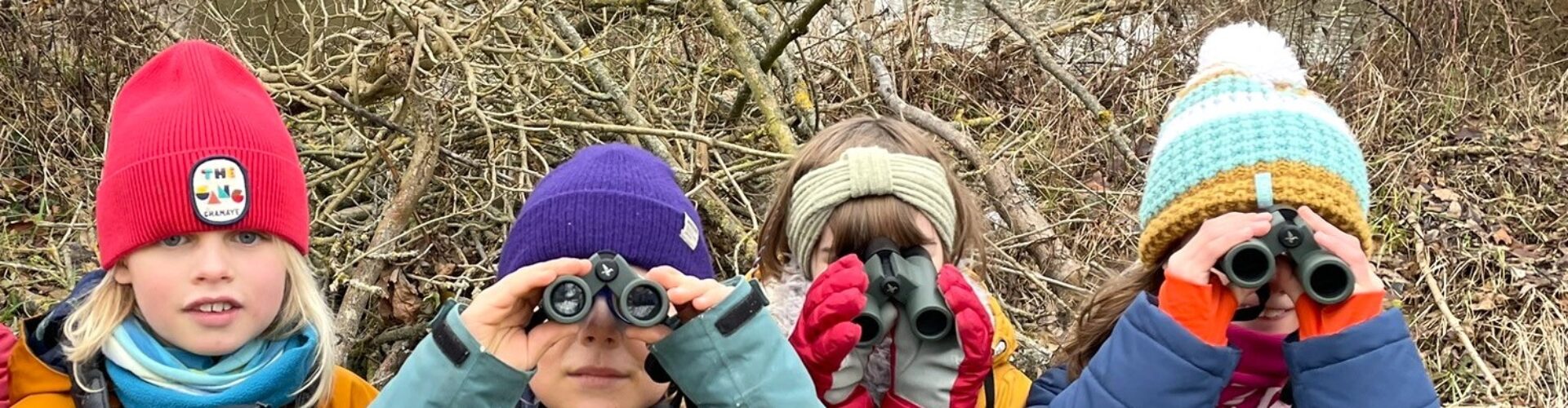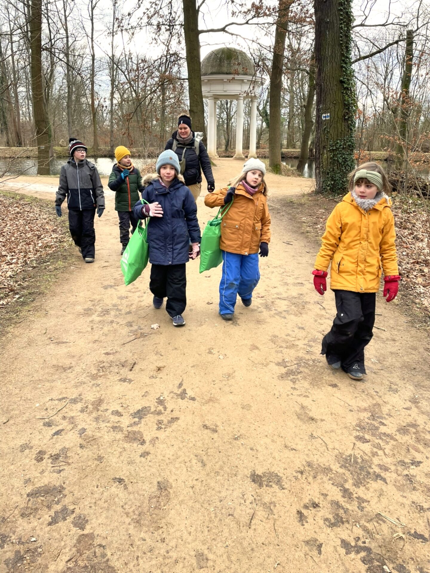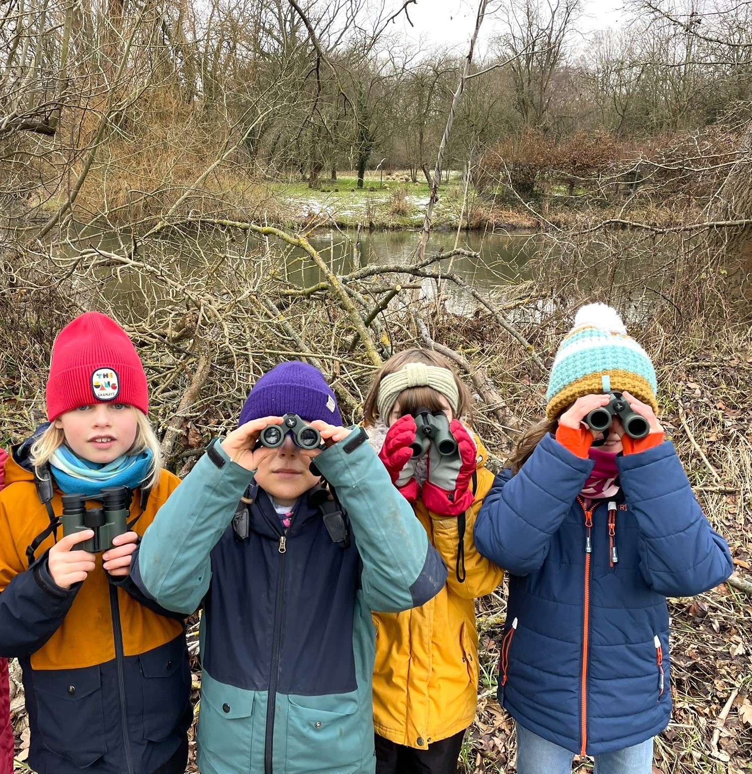 Im Kaminzimmer der Auwaldstation angekommen, sollte der nächste Punkt des Tages die Teilnahme an der Stunde der Wintervögel des NABU werden. Deshalb wurde erstmal die Benutzung der Ferngläser geübt. Die richtige Position zur Beobachtung und die Feinjustierung der vielen Rädchen an den Ferngläsern ist hierfür wichtig. Einige Vögel aus Stadt und Garten kenne die JuNa schon aus vorigen Treffen oder aufgrund eigenen Interesses an der Vogelkunde. Andere sollten sie hierbei kennenlernen. Die Stunde der Wintervögel wurde nahe der Auwaldstation an dem Fließgewässer Weiße Elster durchgeführt. Ein JuNa-Kind trug die Ergebnisse in den Meldebogen ein, die anderen beobachteten mit Bestimmungshilfen im Gepäck in Zweiergruppen die Umgebung. Neben Rabenkrähen, Kohlmeisen und Stockenten, entdeckten die Kinder auch einen Rotmilan und ein Paar Schellenten. Durch den regen Besucherverkehr und eine Gruppe Mountainbiker wurden die Kinder mehrfach aus ihrer stillen Beobachtung geholt. Das machte den Kinder bewusst, wie es für die Tiere sein muss, den Menschen immer wieder auszuweichen.